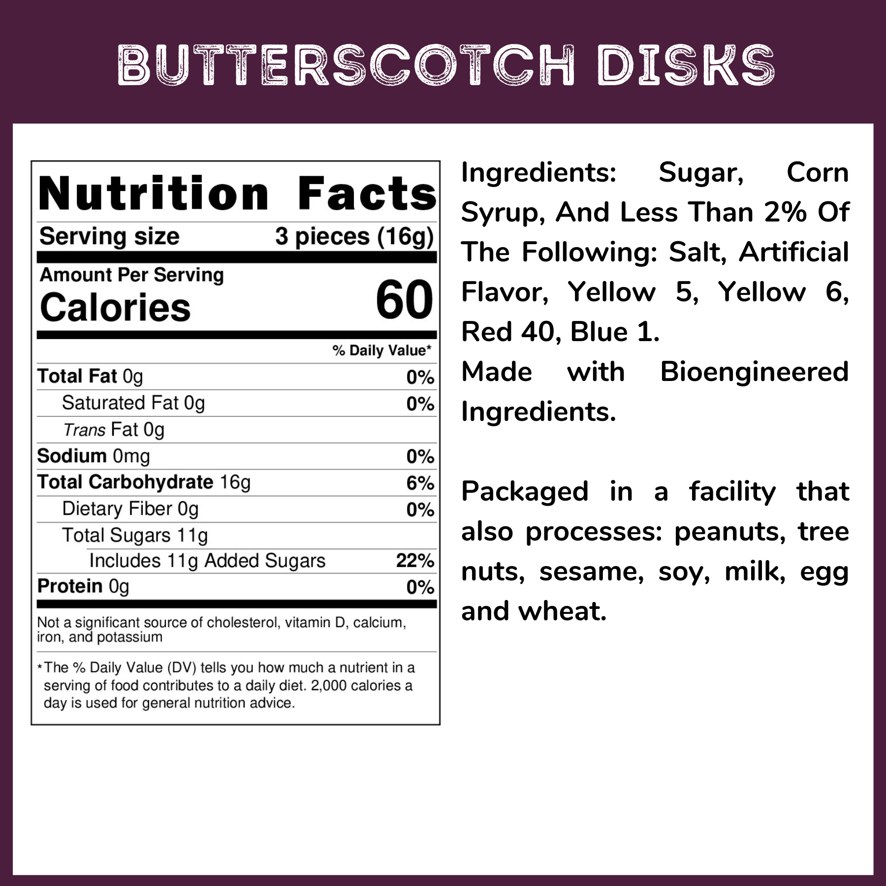 Ingredients: Sugar, Corn Syrup, And Less Than 2% Of The Following: Salt, Artificial Flavor, Yellow 5, Yellow 6, Red 40, Blue 1.