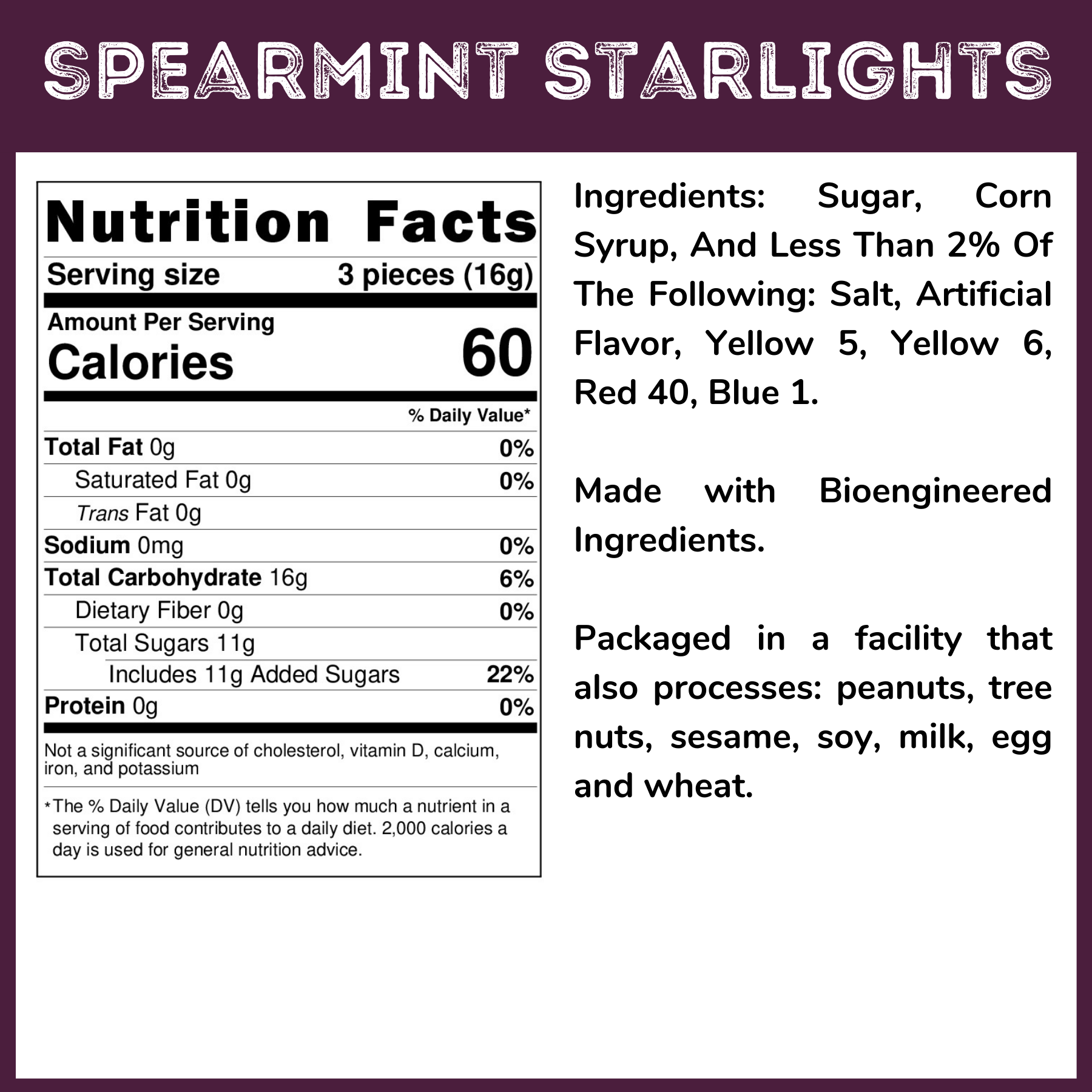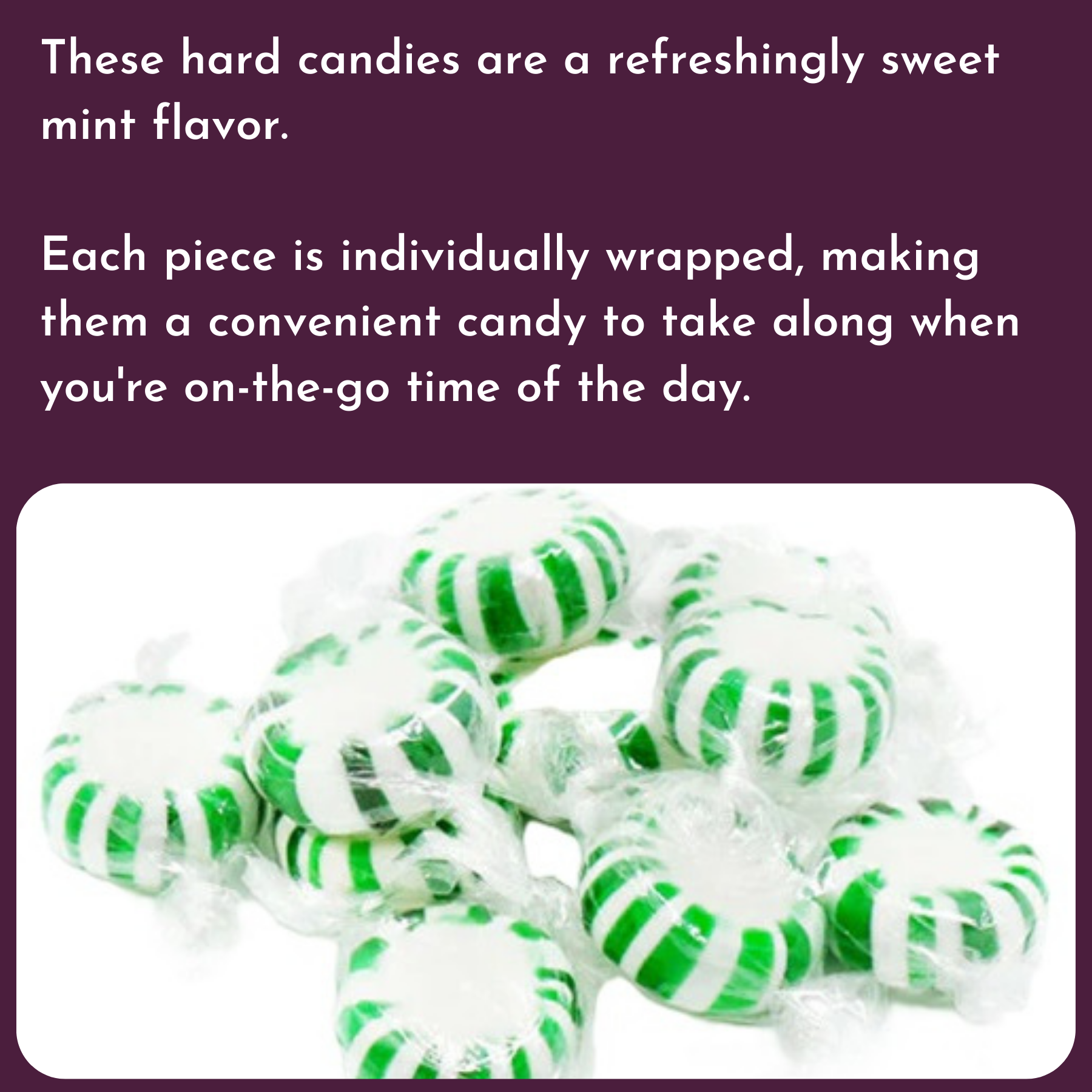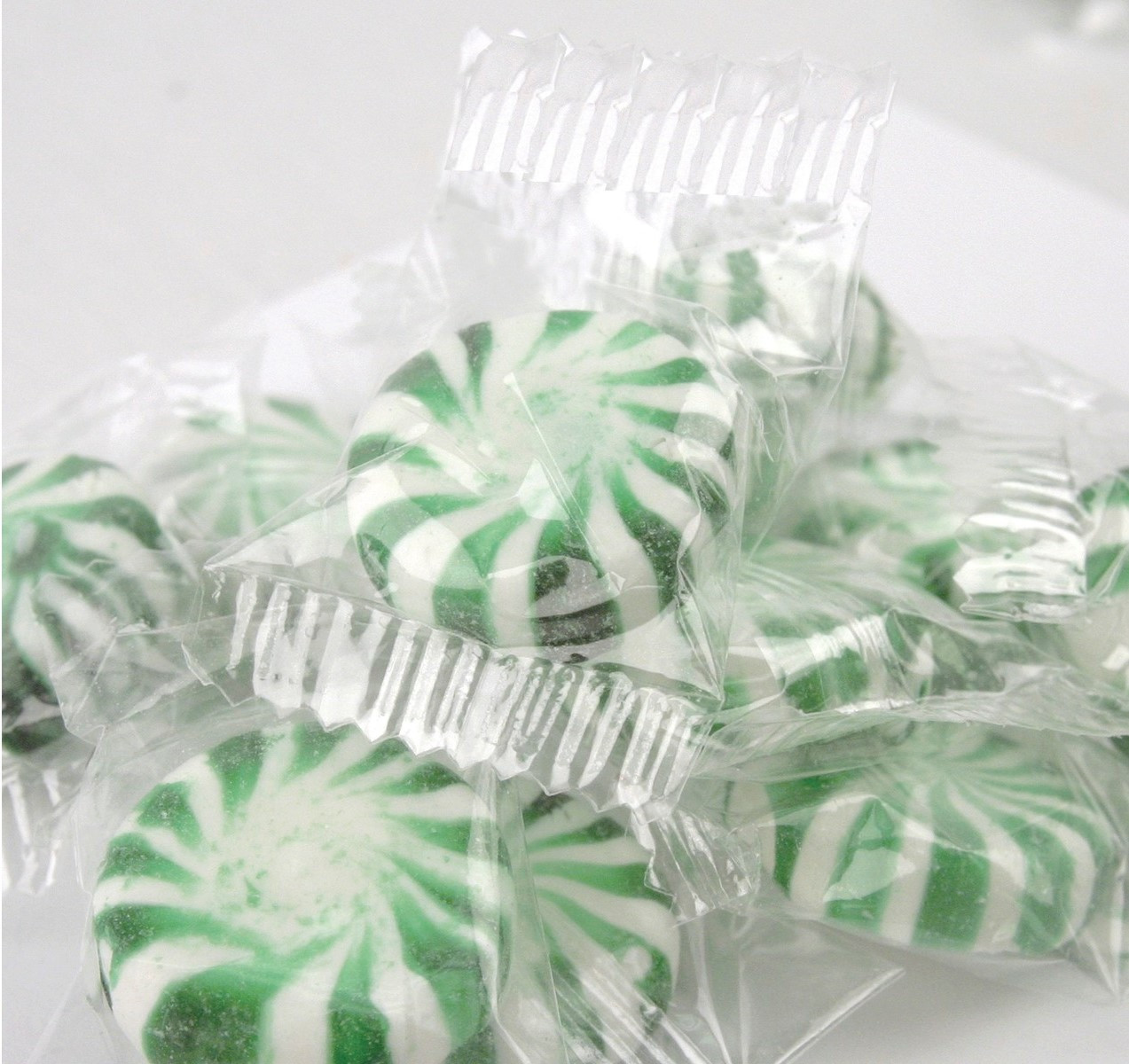Ingredients: Sugar, corn syrup, natural spearmint oil, titanium dioxide (for color), artificial colors (yellow 5, blue 1).