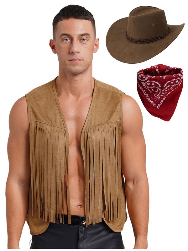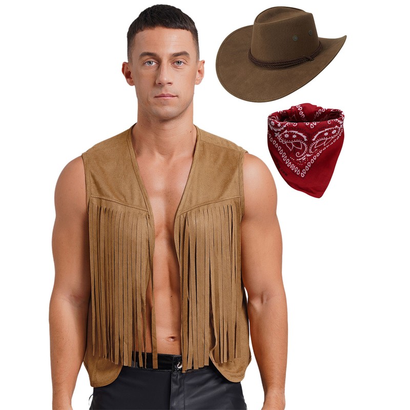 Mens Cowboy Costume Set Retro Tassel Waistcoat Masquerade Sun Hat Western Party