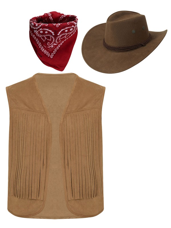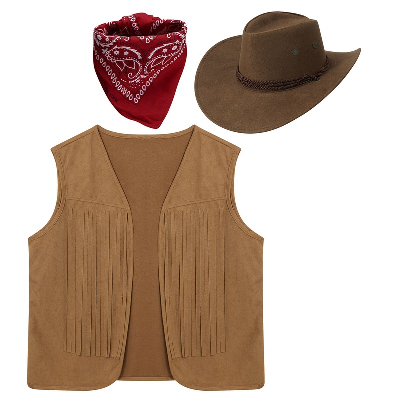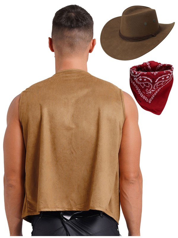 Men’s western cowboy set includes a waistcoat, a cowboy hat and a bandanna, 3-piece set. Made of high-quality fabric and materials.