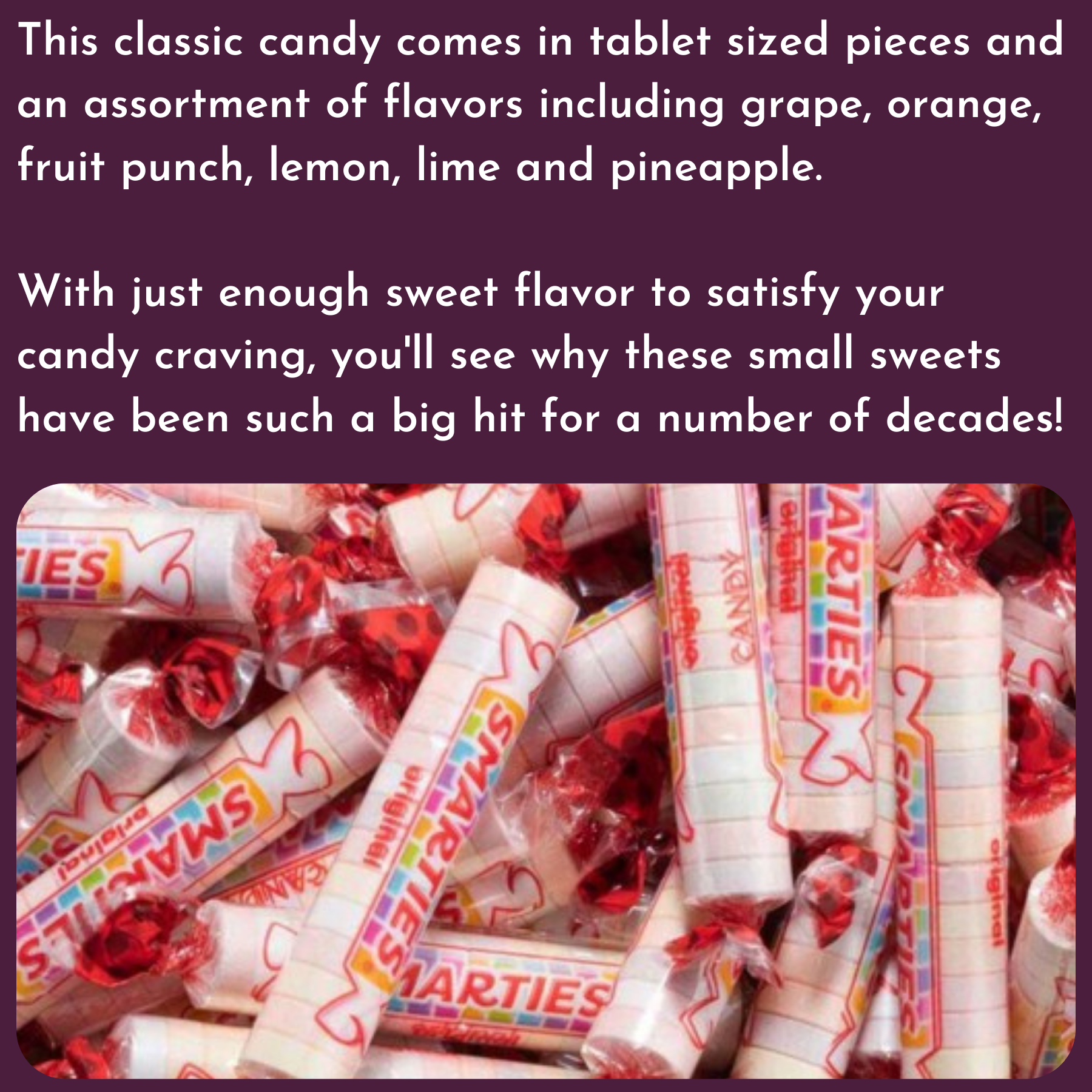 Ingredients: Dextrose, Citric Acid, Calcium Stearate, Natural And Artificial Flavor, Color (Red 40 Lake, Yellow 5 Lake, Yellow 6 Lake, Blue 2 Lake).