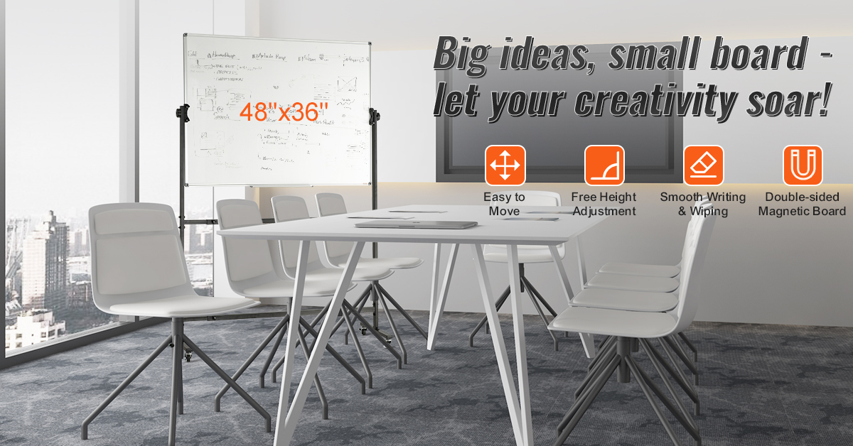 - Double-sided Magnetic Board: The 48''x36'' rolling whiteboard is double-sided, providing ample space to organize ideas, teach lessons, or present work. Its 360-degree rotatable feature allows for easy switching between the two sides. Equipped with 4 casters, the mobile whiteboard moves smoothly and locks firmly in place with the brake.