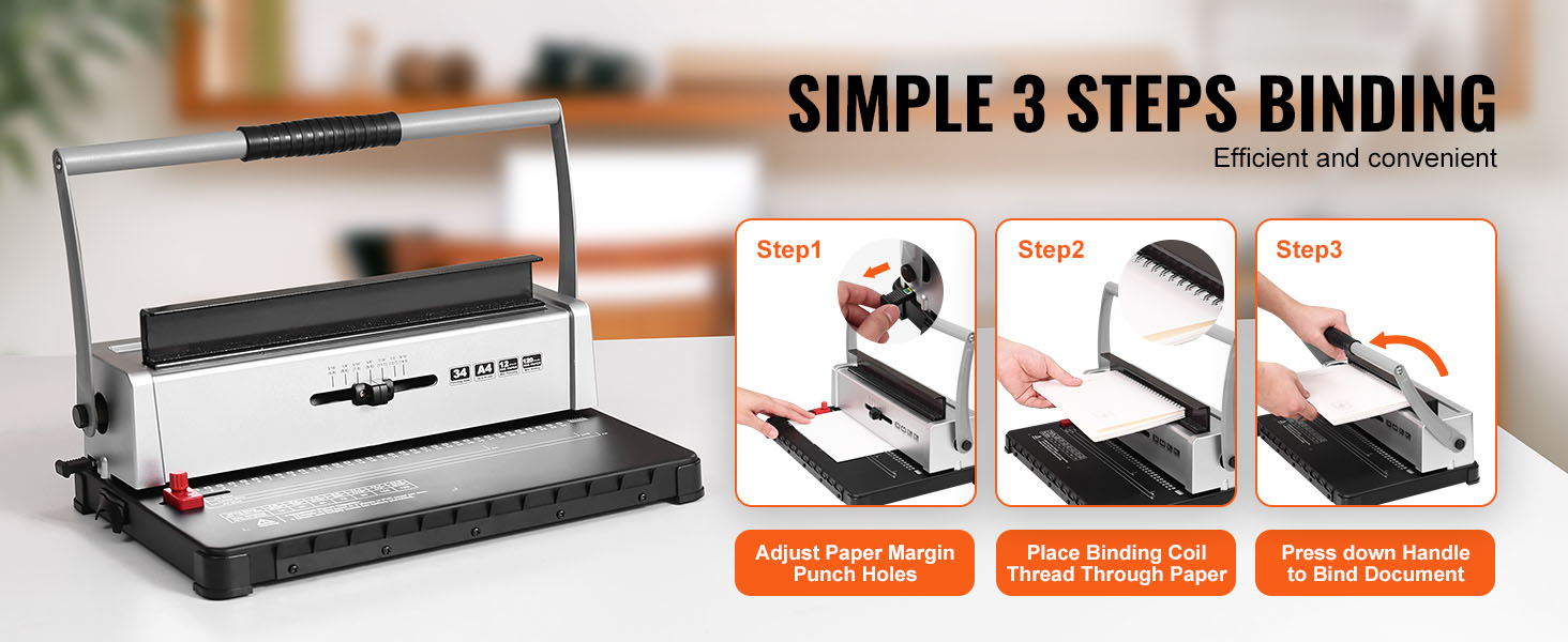 Easy to Operate: Designed for user convenience, our coil binding machine features adjustable edge guides and side margins, and adjustable binding spine sizes from 3/16" to 9/16" (binding spines need to be purchased separately). Simple operatiom with a handle lever press.