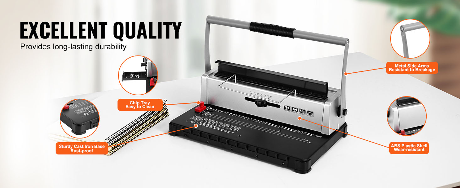 Sturdy & Durable Material: Crafted with a cast iron base with a powder-coated surface, our book binder is robust and rust-resistant. The ABS plastic shell is wear-resistant and not easily cracked. Metal side arms and carbon steel blades ensure durability and precise punching.