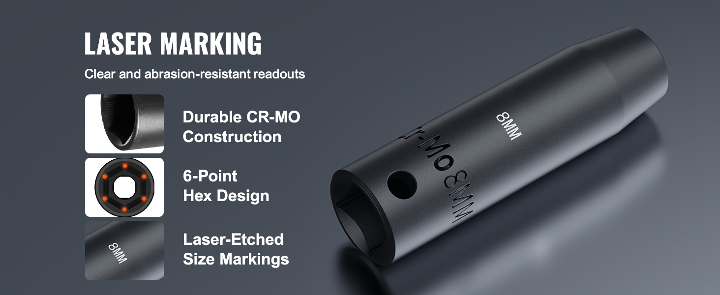 Using laser etching and rolling processes, the extra-large size markings on the sockets are clear and easy to identify even under various lighting conditions. The markings are also resistant to wear.