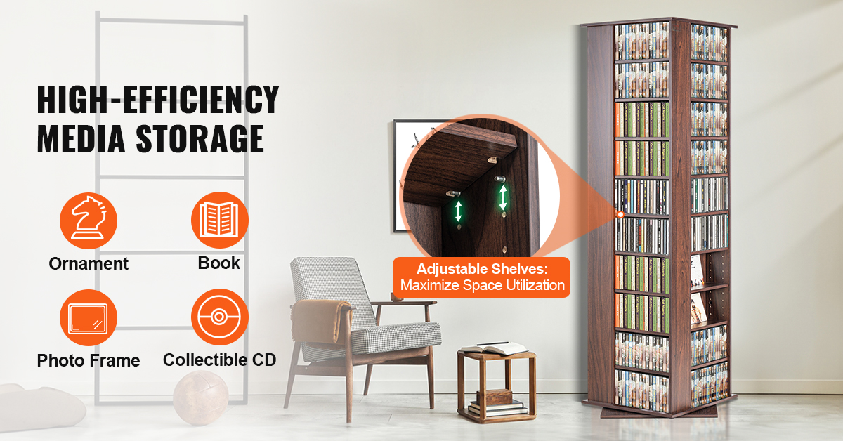 The versatile and creative spinning media storage tower that maximizes storage capacity with adjustable shelf. It effortlessly accommodates your prized DVDs & CDs, books, small decorations, photos, and collectibles, keeping your items neatly organized.
