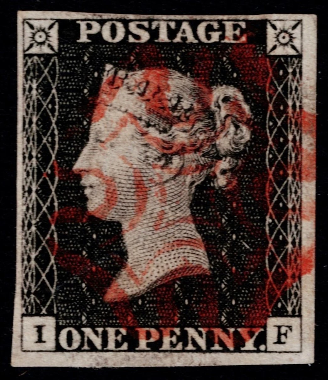 A superb used 1840 1d Black from Plate 2, lettered IF with four good to large margins and cancelled by a fine, red Maltese Cross. Variety: 'no ray flaw'. SG 2 Cat. £375.00