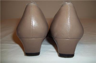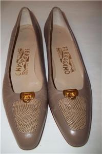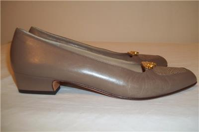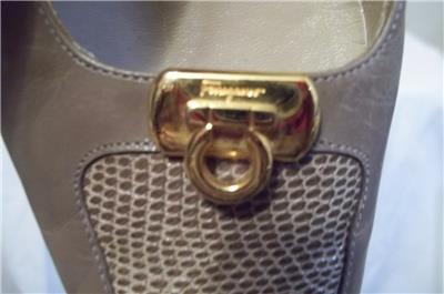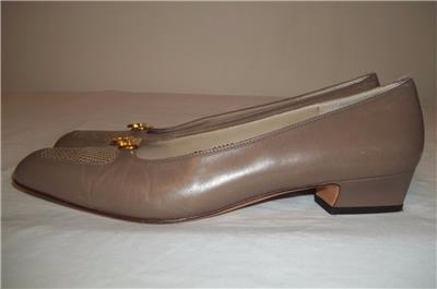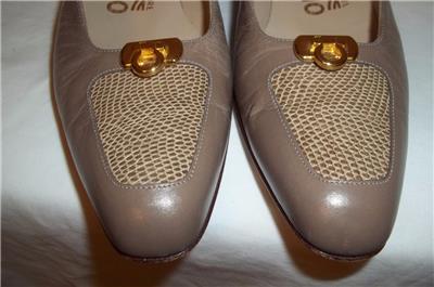 Taupe Leather Reptile Toe Gold Logo Low Heel Shoes with Reptile detailing at toe.