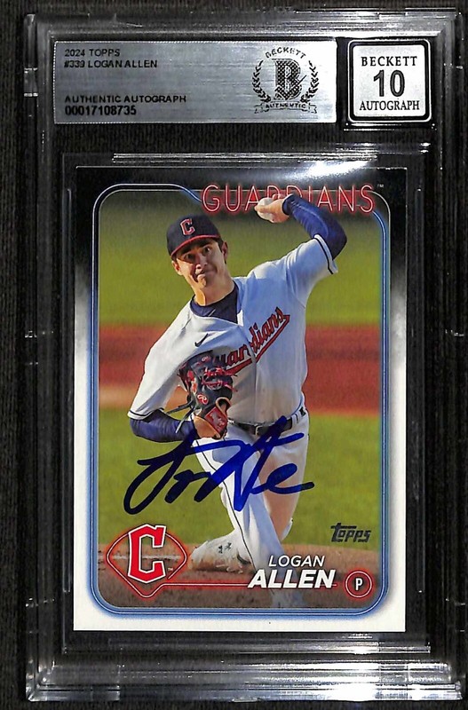 Autographed 2024 Topps #339 signed in blue permanent marker by Cleveland Guardians pitcher Logan Allen. From the Steve Grad Autograph Collection. The autograph has been authenticated and graded a perfect 10 by Beckett Authentication Services.