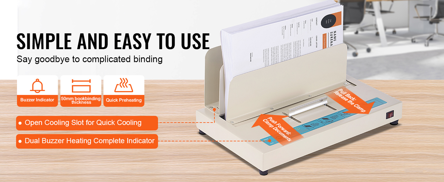 Simple to Use: No need for punching holes, just a single button to bind. The manual clamping rail prevents paper from falling out, and the open cooling slot ensures rapid cooling. Make document binding more secure and efficient with our thermal binding machine!