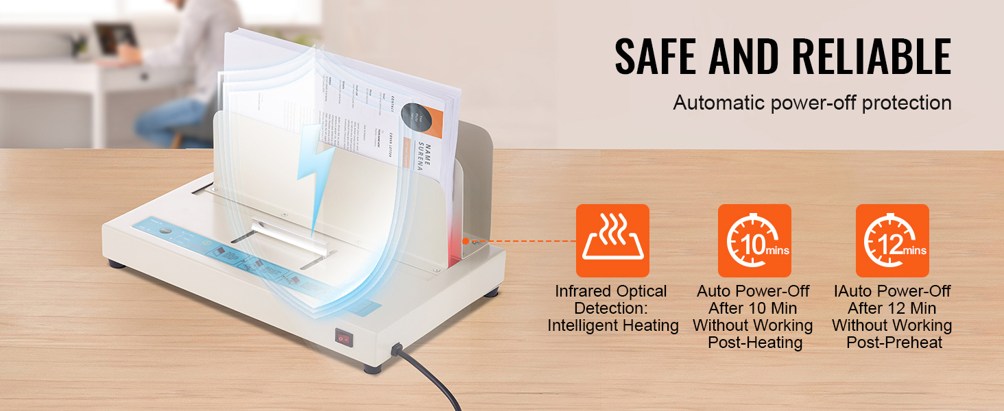Our thermal book binder will auto-power off after 10 minutes of inactivity and 12 minutes post-preheat, ensuring safe usage.