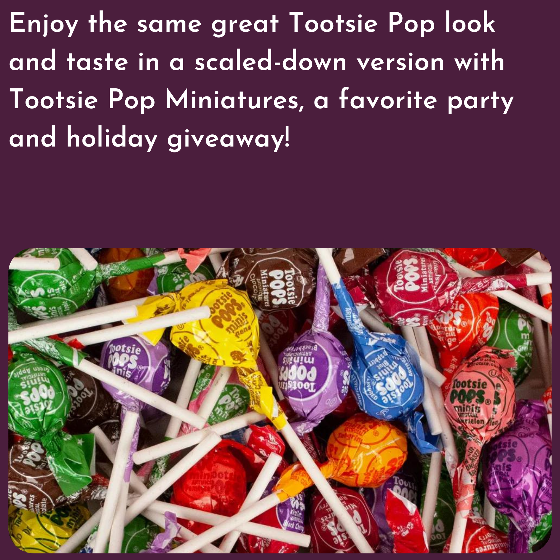 Enjoy the same great Tootsie Pop look and taste in a scaled-down version with Tootsie Pop Miniatures, a favorite party and holiday giveaway.