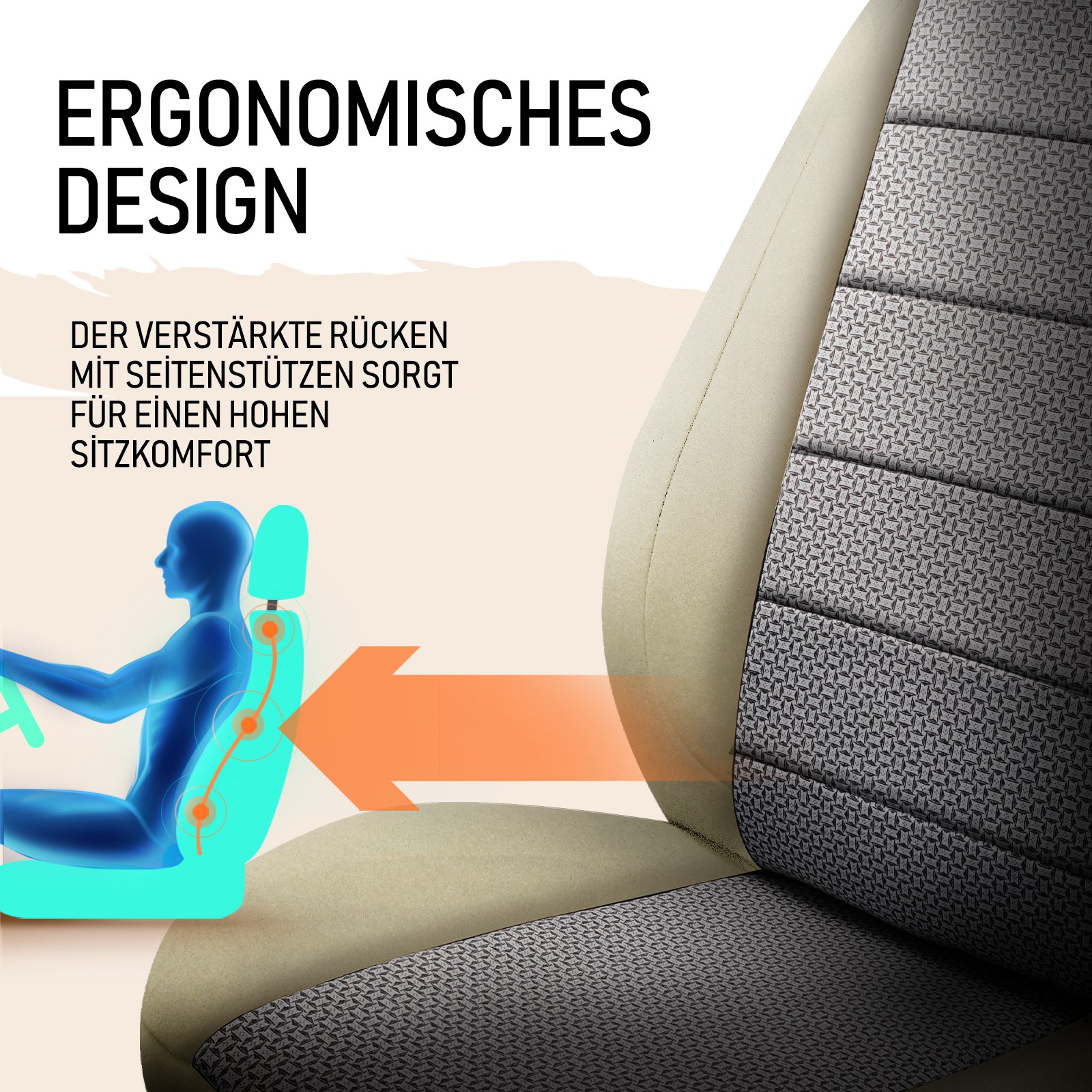 Die Sitze werden komplett bezogen. Dank Zugbänder an strategisch wichtigen Punkten haben Sie eine hohe Rutschfestigkeit.