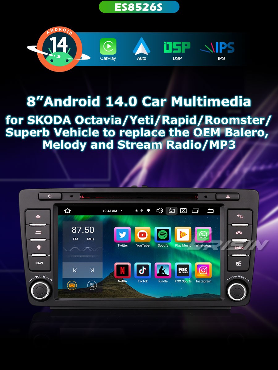 ES8526S 8" Octa-Core Android 14.0 Car Multimedia CarPlay & Auto GPS TPMS/DVR/DTV/DAB-IN...