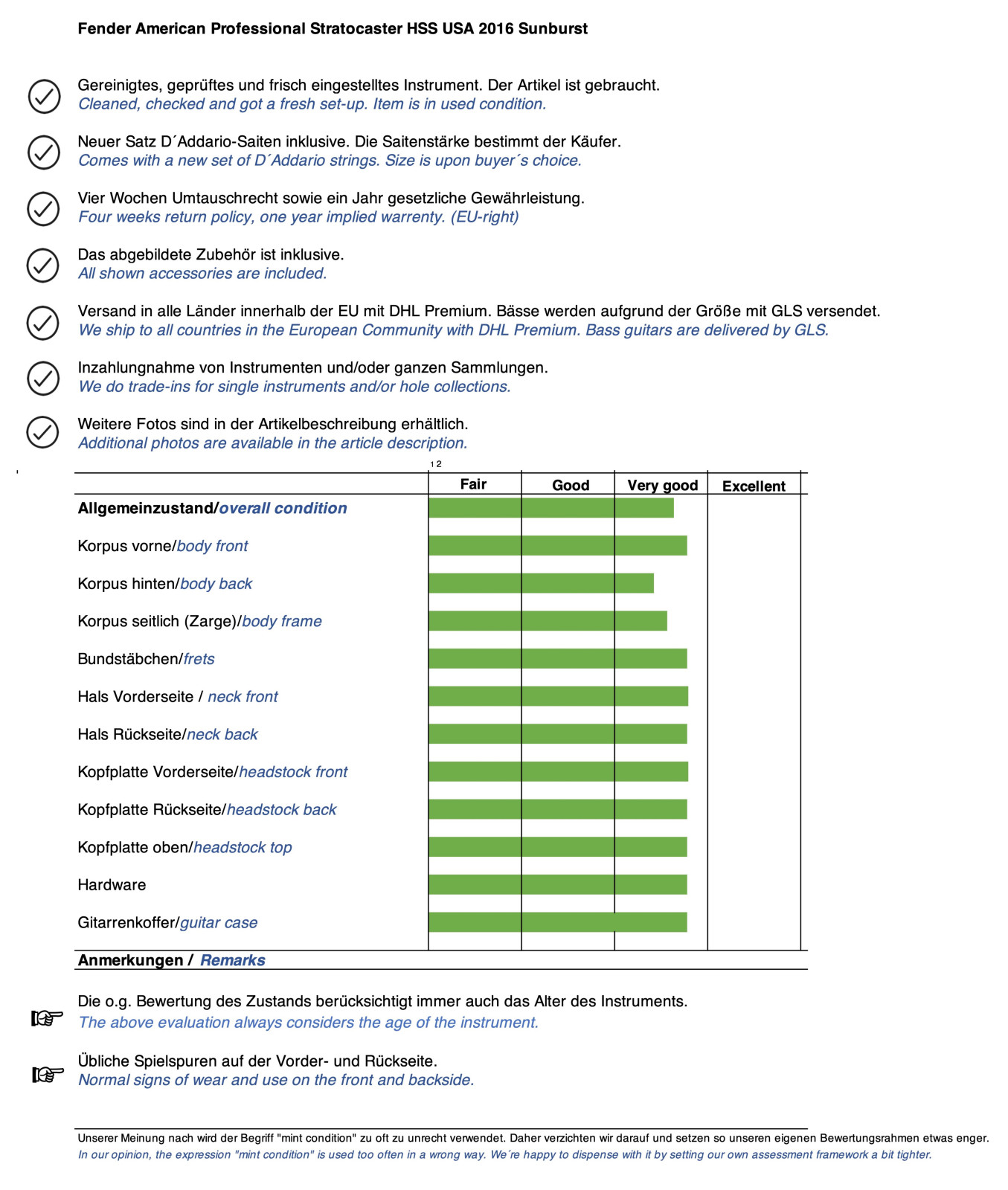 You buy exactly the instrument which is displayed on the photos including its shown accessories. Usually, these pictures should show you all signs of use of the instrument.