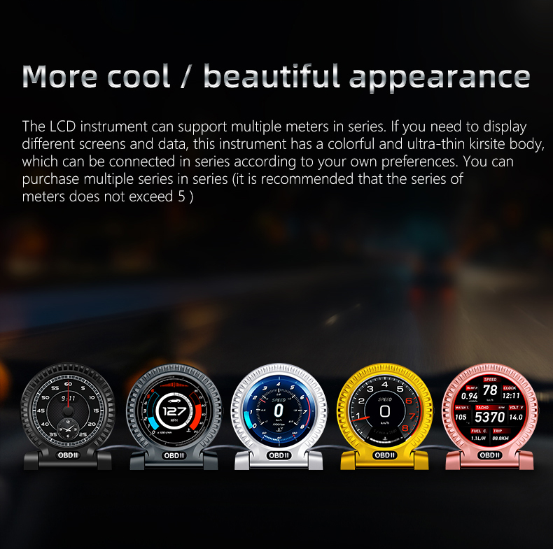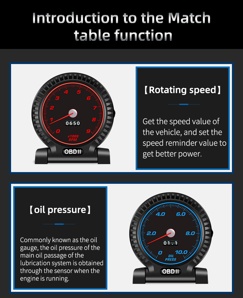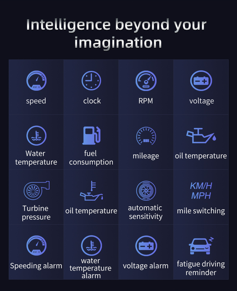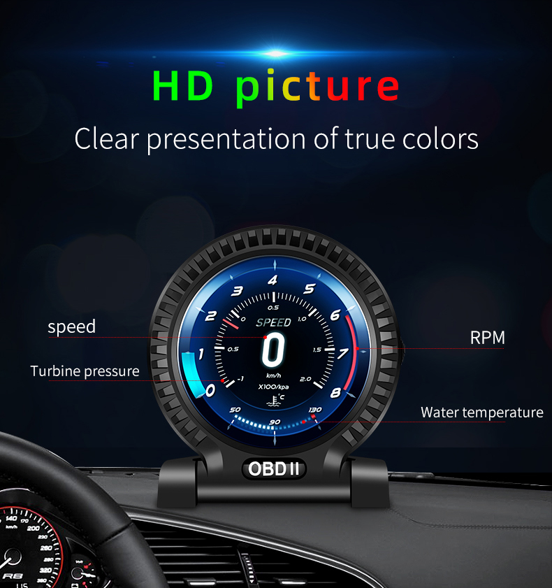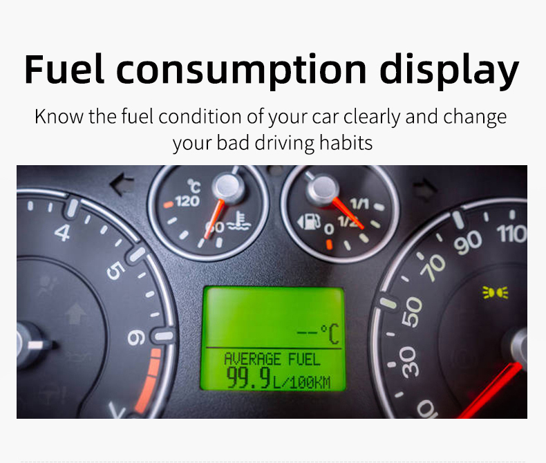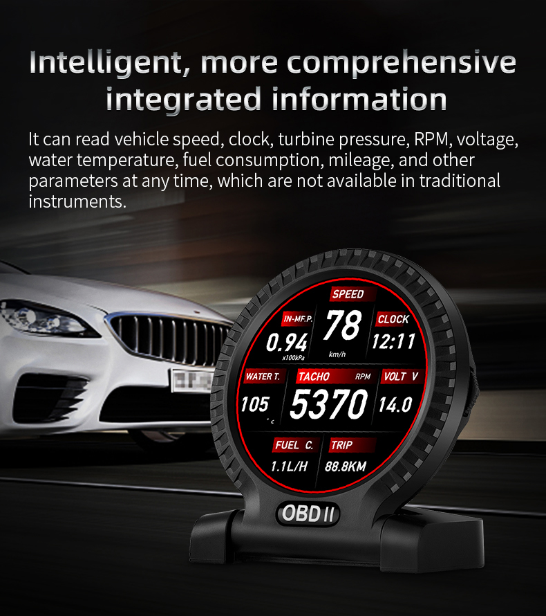 Thank you for purchasing the automobile OBD multi-function display produced by our company. This product reads the driving data of the vehicle through the OBD2 platform of the car ECU computer, such as vehicle speed, rotation speed, fuel consumption, water temperature and voltage, etc., and instantly reads the driving information under the condition that the wide field of view does not shift during the car driving, so as to prevent the driver from driving Looking down at the instrument during the process affects safety, this product does not rewrite any data in the ECU.