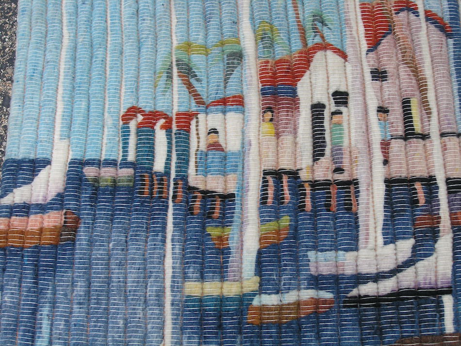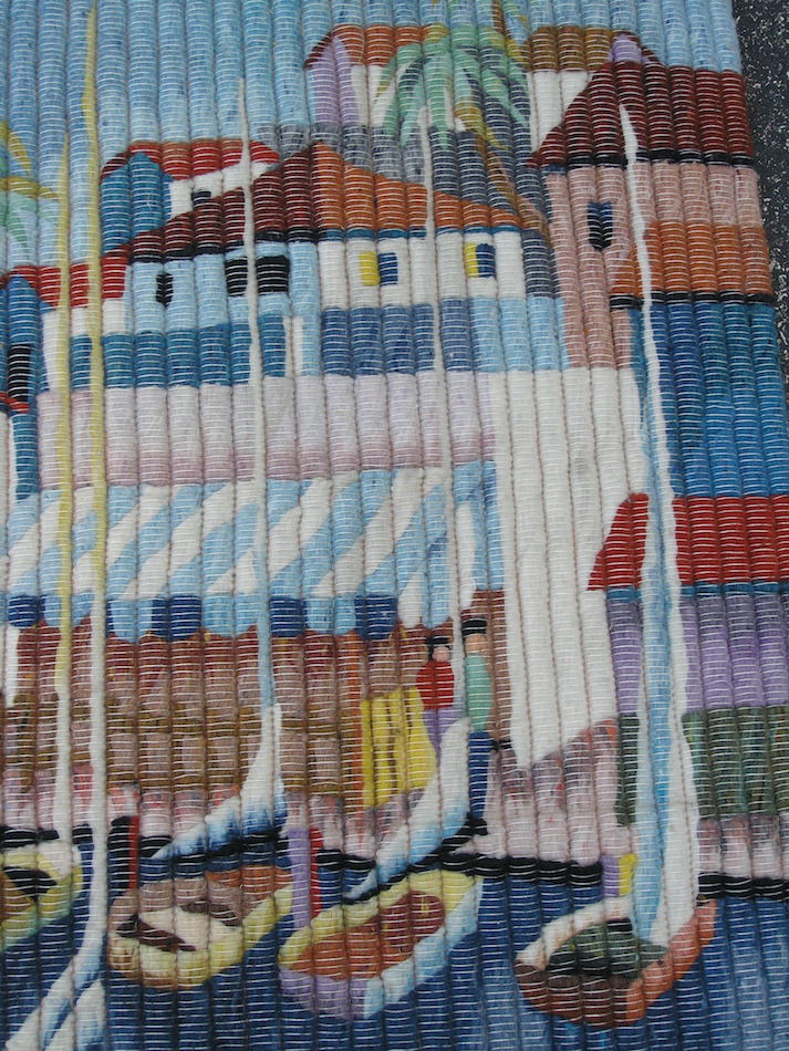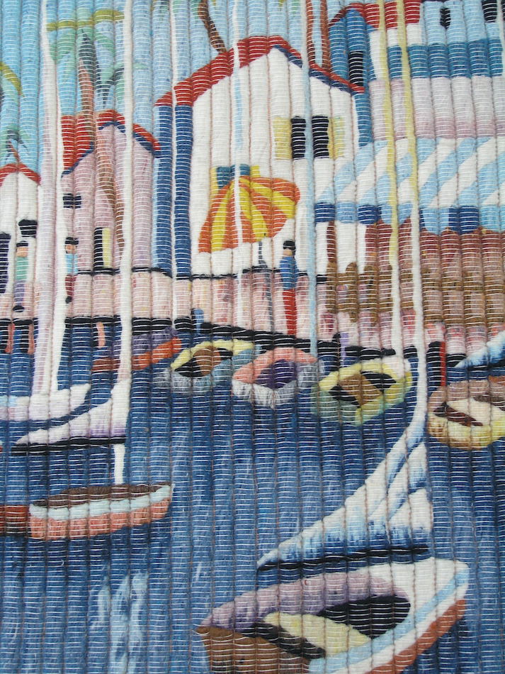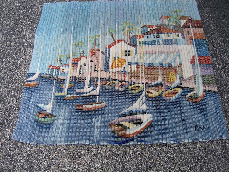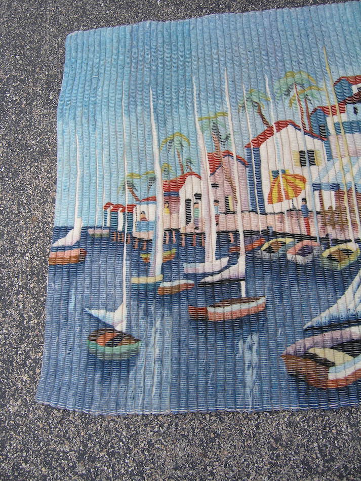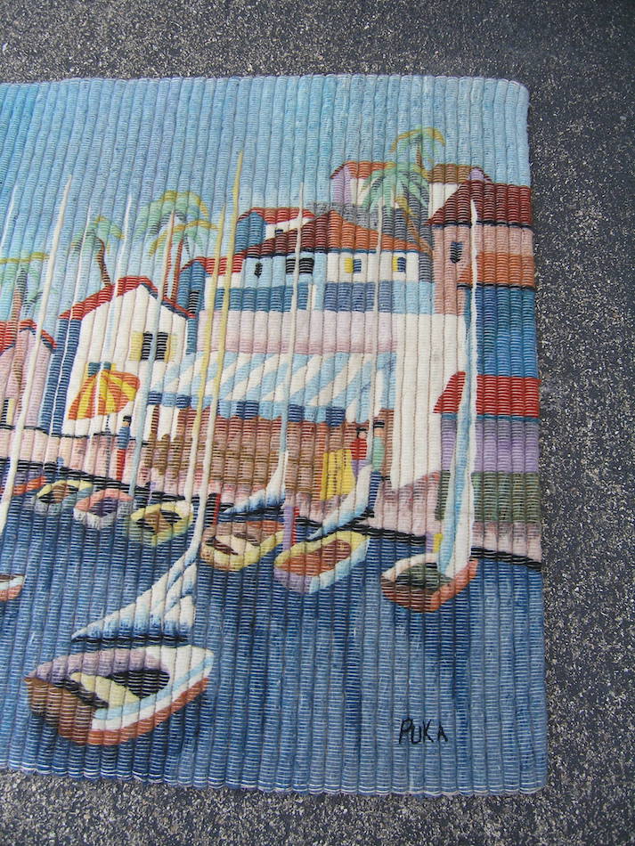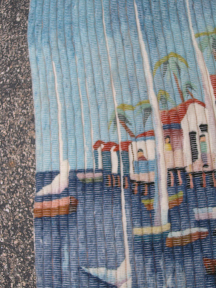 This listing is for aVintage Peruvian Hand Woven Wool and Cotton Hanging Tapestry with A Seaside / Seascape motif in great colors , of Boats , Buildings , Trees , People , and ... measuring about 41 1/2 x 45 1/2 inches,with Wool weave and cotton foundation as shown.