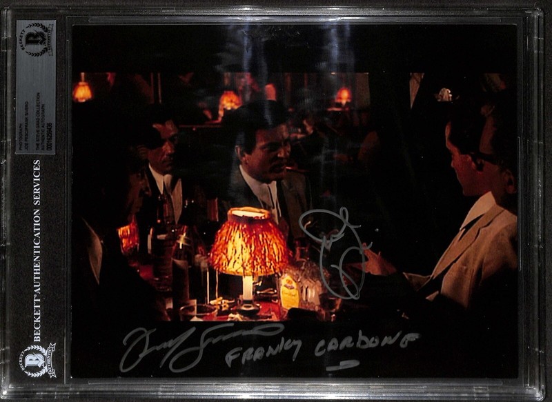 Autographed 8x10 color photograph signed in silver permanent marker by actors Joe Pesci and Frank Sivero from the movie Goodfellas. From the Steve Grad Autograph Collection and both signatures obtained in person by Steve. Pesci signed this photo in 2006/2007 at the LA PD Golf Tournament while Sivero signed this at a Hollywood Collectors Show in 2006. Sivero has added his character name, "Franky Carbone". The autographs have been authenticated by Beckett Authentication Services.