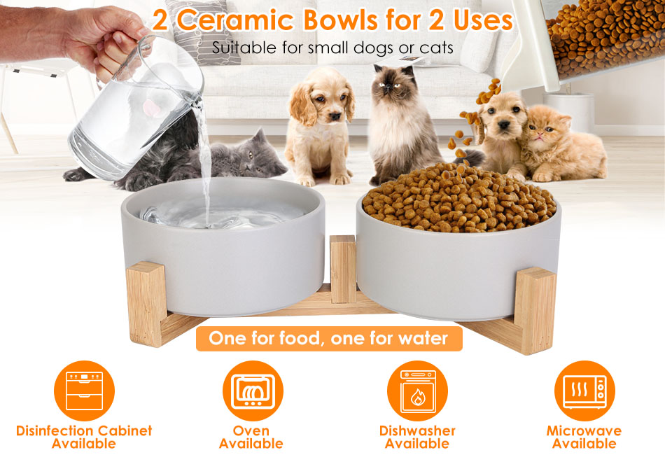 Our pet bowls feature a wooden stand to elevate the bowls off the ground, promoting better posture and digestion for your pet. The 2 bowls come with 57.4Oz capacity in total, suitable for small dogs or cats older than 1 year old. Also, made of ceramic, our bowls are and safe for pets, ensuring that their meals are served in a healthy and secure manner. Microwave and dishwaher available, easy to clean.