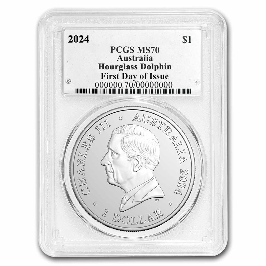 This certified 2024 1 oz Silver Dolphin coin would be a great addition to any coin collection. The certification by PCGS adds even more authentication to this beautiful Australian coin. Add this 2024 1 oz Silver Dolphin MS-70 PCGS First Day of Issue coin to your cart today!