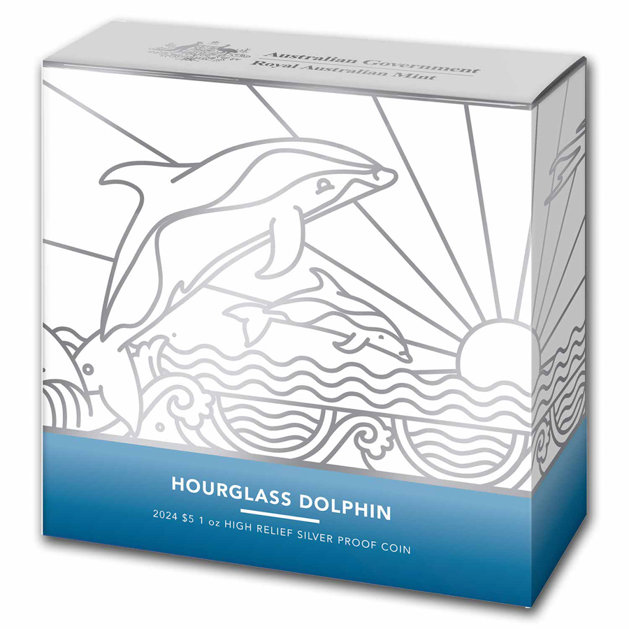 The intricate detail of the hourglass dolphins shines in this low mintage, high relief coin from Australia. With a low, limited mintage, these coins are expected to sell quickly! Don't miss your opportunity to add the 2024 1 oz Silver Dolphin High Relief Proof coin to your cart today!