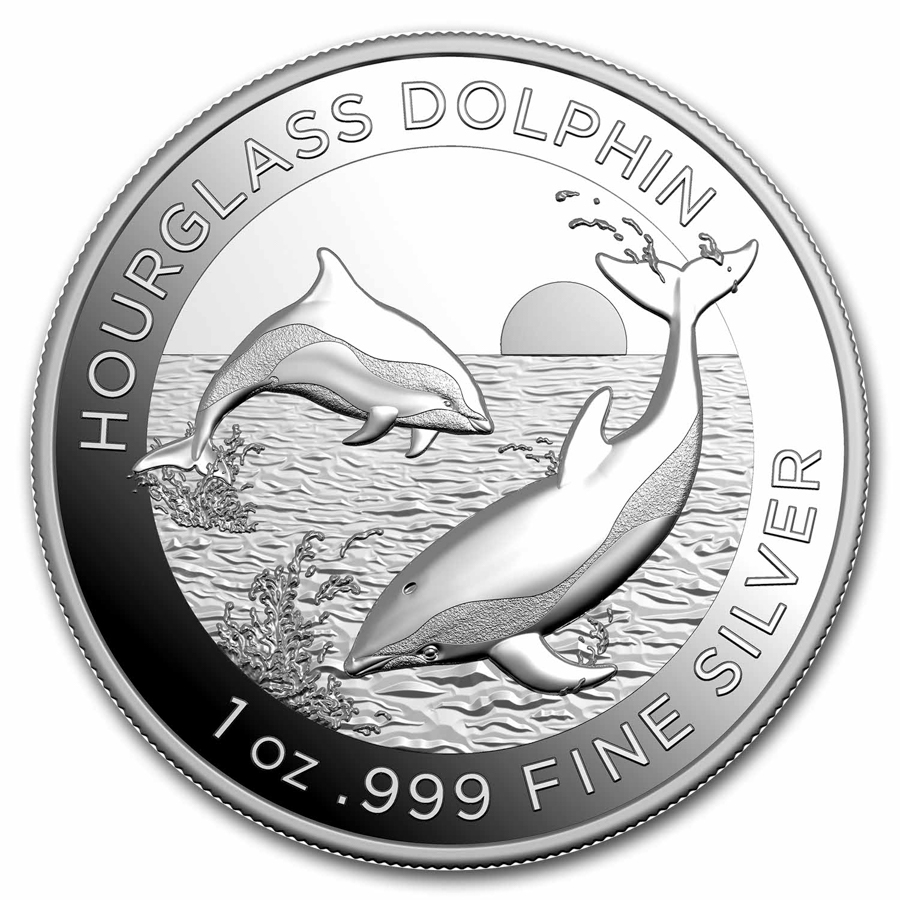 - Reverse: Features two hourglass dolphins, with one dolphin splashing with his fin under water and another leaping into the sea toward the horizon. Also included is the metal content and purity.