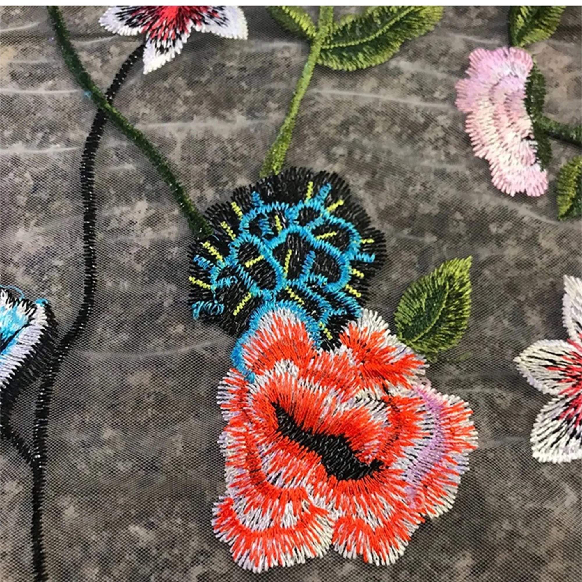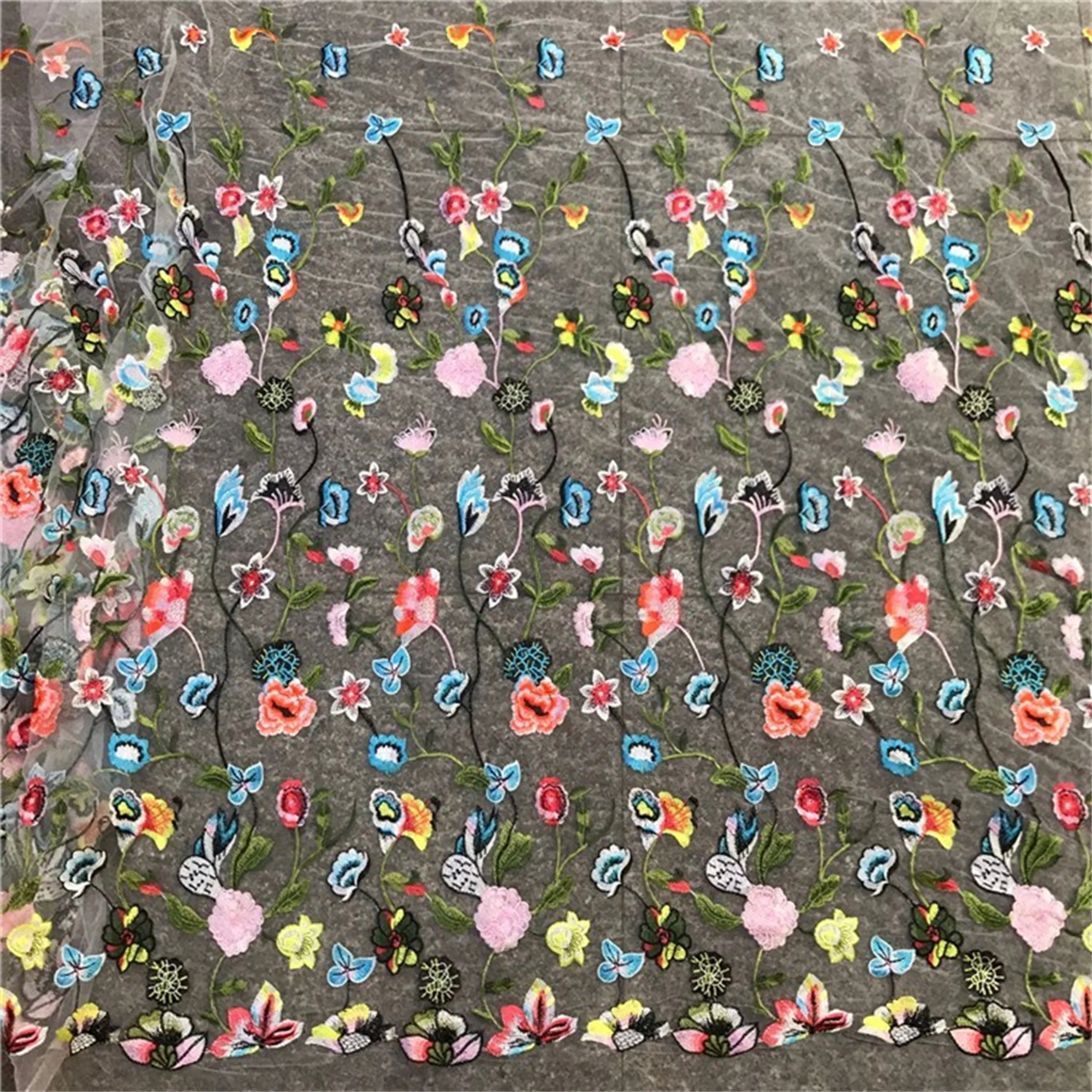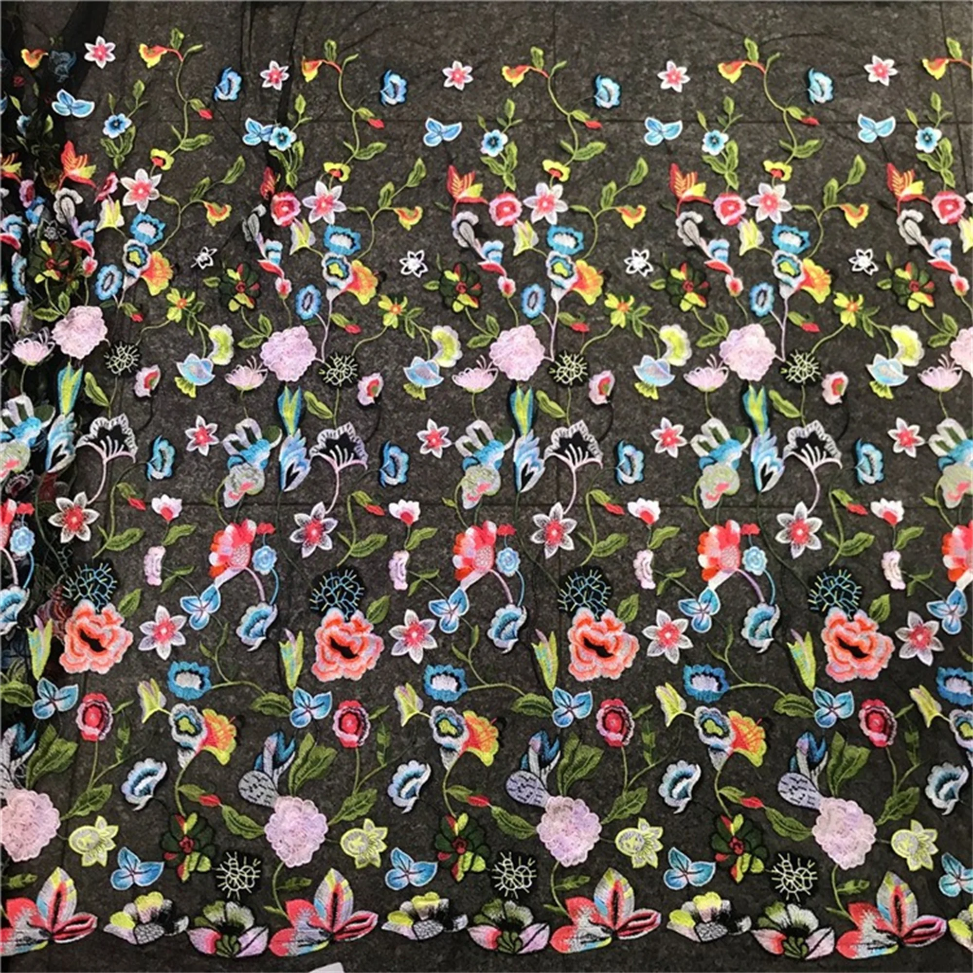 Black mesh lace, embroidery colorful flower fabric, perfect for personalized wedding gown, haute couture, bridal dress, evening wear.