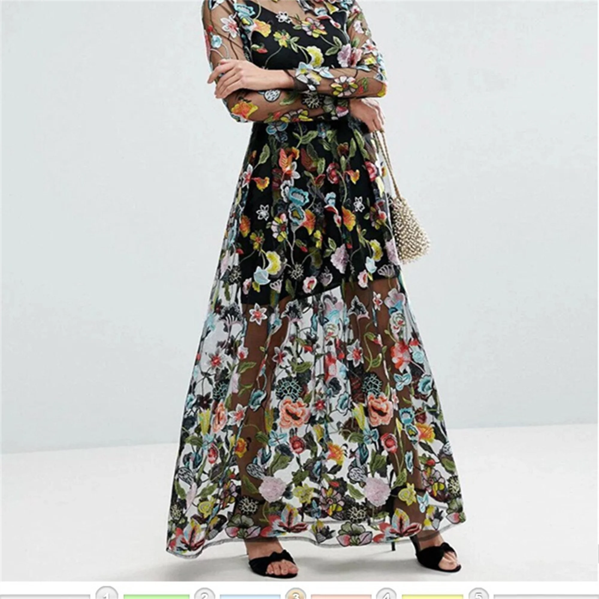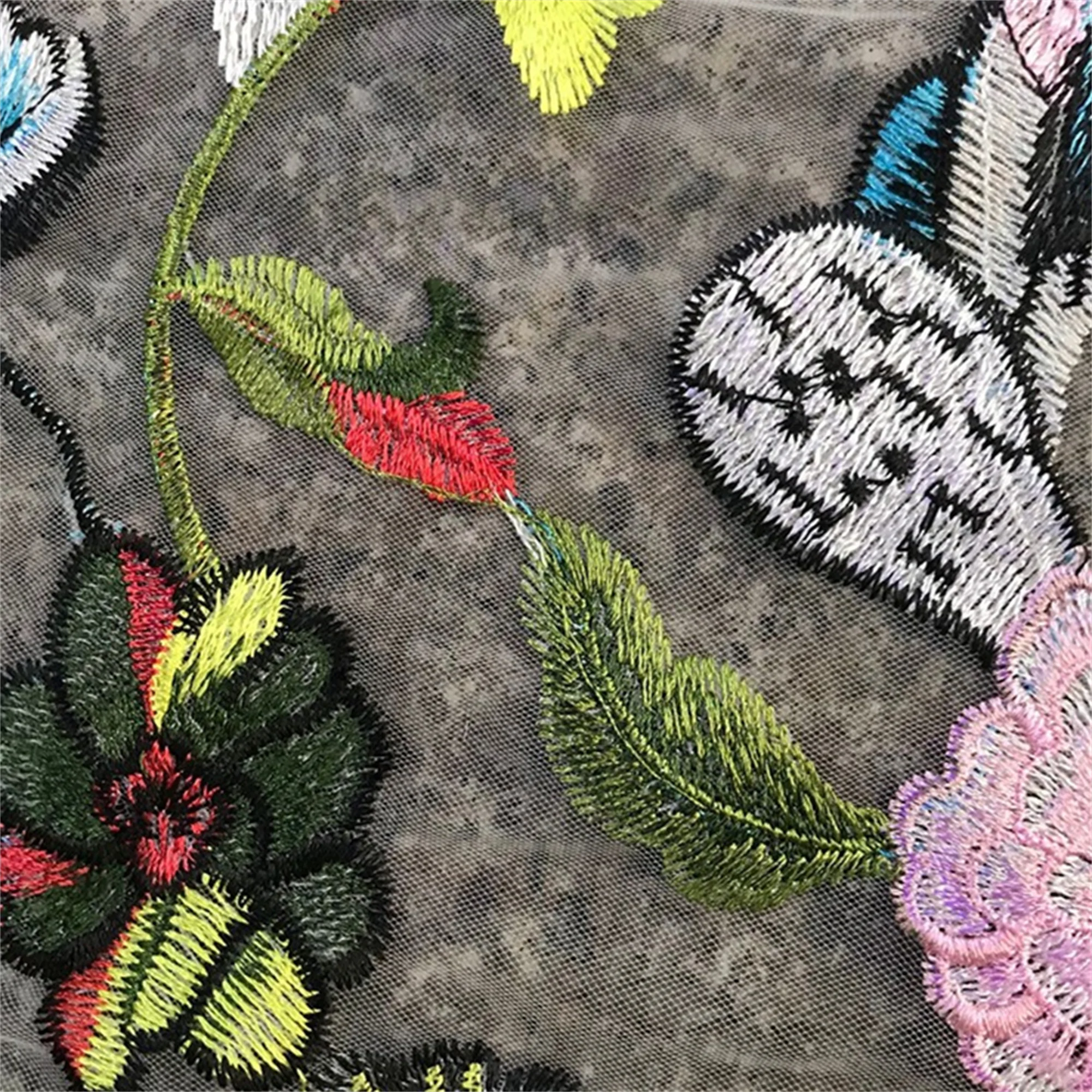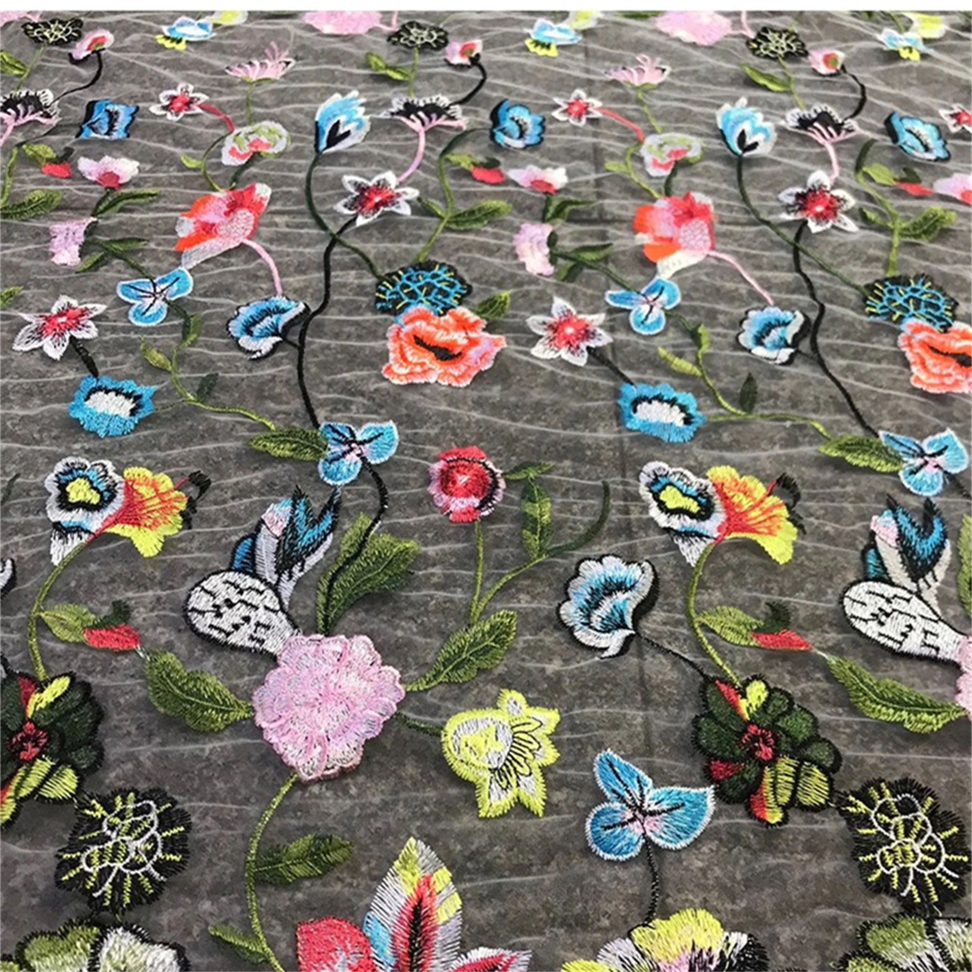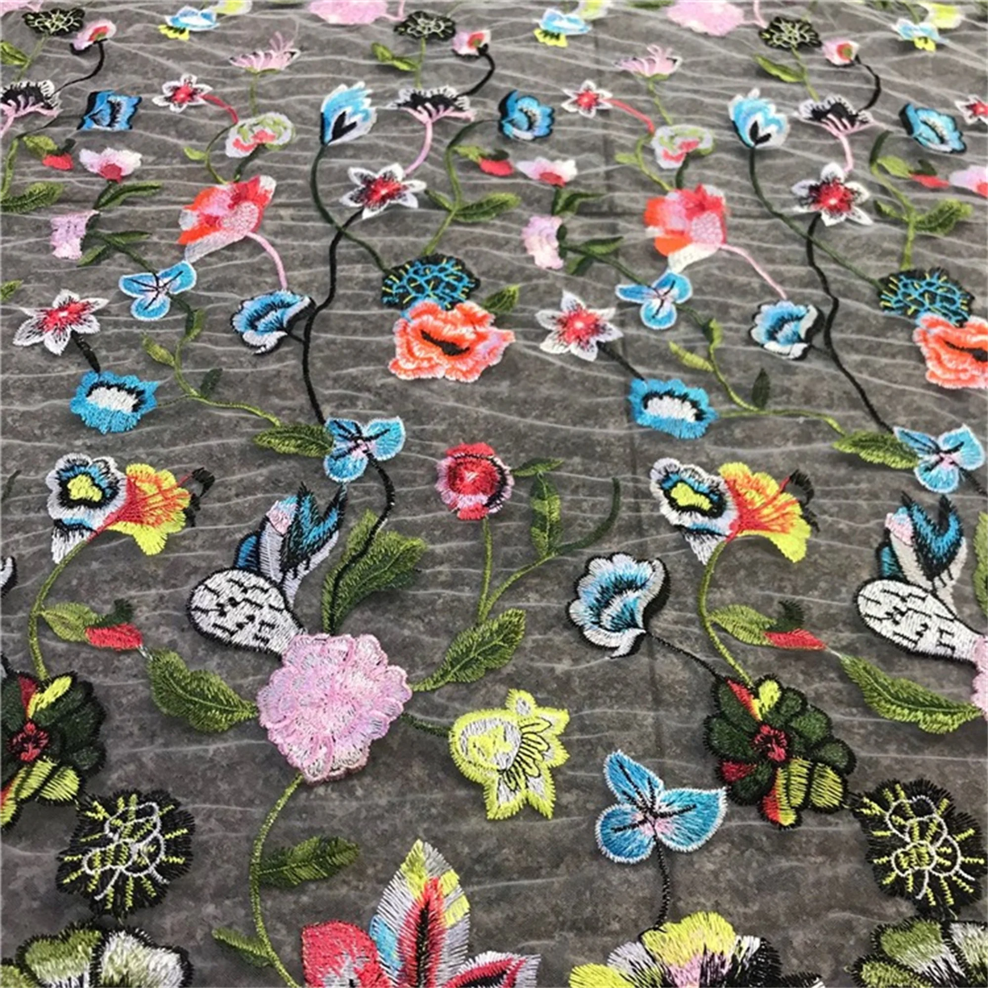 Black mesh lace, embroidery colorful flower fabric, perfect for personalized wedding gown, haute couture, bridal dress, evening wear.