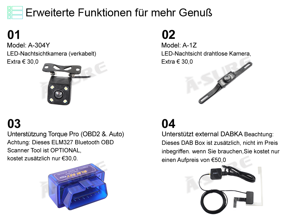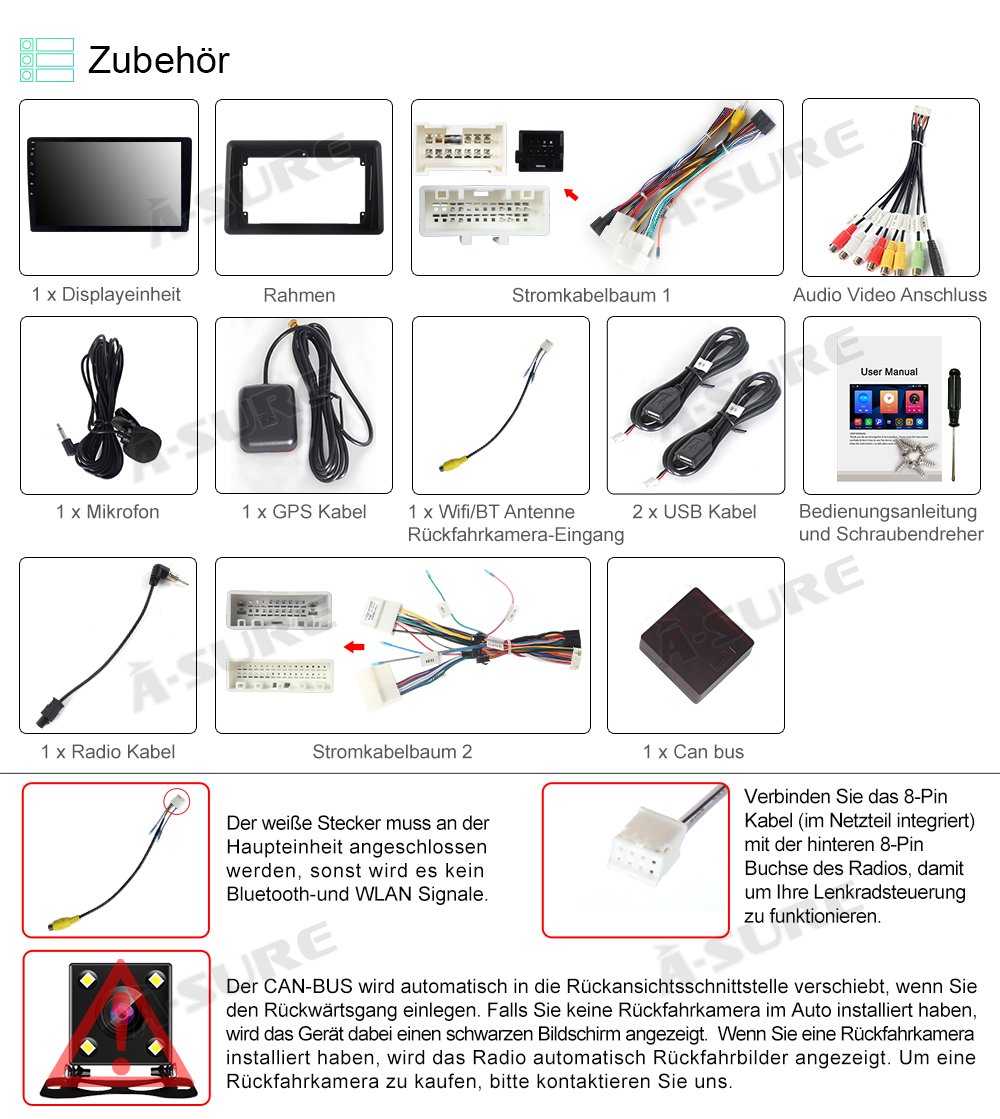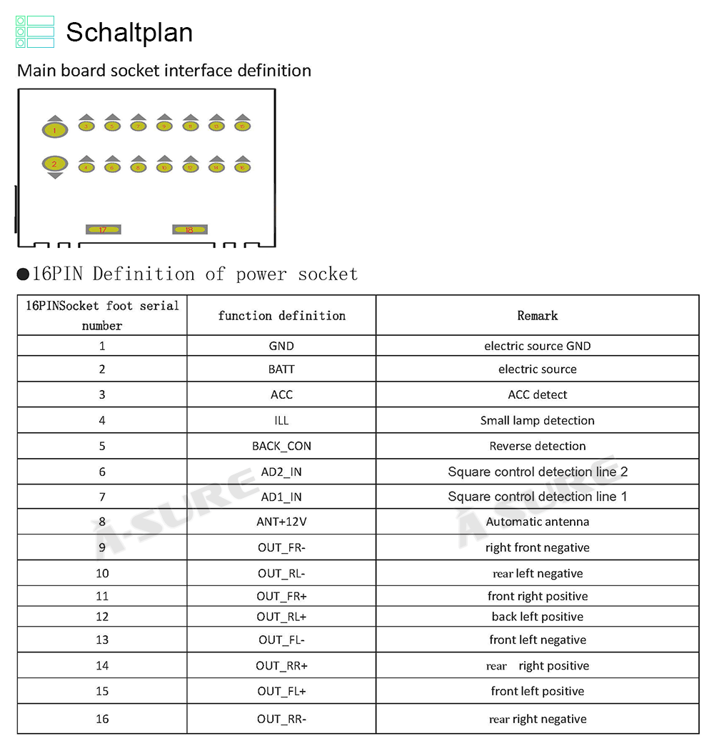 Technische Parameter Passwort -Werkstatt Setup: 3368 Passwort -Werkseinstellung zurücksetzen: 0000 Main -IC-Arbeitstemperaturbereich: -30°C bis 70°C (Fahrzeug Standard) -OS: Android 14 -HD Decoder: 4K@60fps H.265 -Speicher: RAM Samsung DDR3 2GB; ROM 32GB 8MP IPS -CPU: 4 Core CPU ARM Cortex A7 4,1.2GHZ*4 GPU: ARM Mali T820 MP -Chipsatz: si4745 -Multipoint Kapazitiver -Intelligentes Update für Apps -Smartphone-Link: Integrierte Module von Carplay und Android Auto, Unterstützt wireless Verbindung -DIY-Thema - Unterstützt die originale Lenkradsteuerung, um mit dem Autoradio zu funktionieren. - Unterstützt 4G Dongle und WIFI Bildschirm -Auflösung 1280 720 Bildschirm - Touch Screen Funktion -Image Brightness /Contrast Color Adjustable IIlumination -7 traditionelleFarben, darunter Rot, Grün, Orange, Weiẞ, Blau, Cyan-Blau und Lila, Unterstützt benutzerdefinierter Farbe Bluetooth -Eingebaute Bluetooth -Freisprechfunktion Unterstützt Bluetooth MP3 Player Funktion A2DP (Hinweis: Diese Funktion kann nur realisiert werden, wenn das Telefon Bluetooth Audio Bluetooth Output unterstützt) Unterstützt BIuetooth Telefonbuch-Funktion Unterstutzt Bluetooth Verbindung für iPhone 4G & Wifi -Unterstützt 4G-LTE Wifi Dongle -ingebaute Wifi Modul GPS -GPS Port: COM2 -GPS Baud Rate: 9600 -GPS-Dual-Zonen-Funktion: Nutzen Sie die Navigation, während Sie Musik gleichzeitig hören -GPS-Sprache: Japanisch/ Russisch / Chinesisch/ Deutsch / Italienisch / FranZÖsisch/ Arabisch / Griechisch/ Portugiesisch/ Niederländisch etc. -GPS-Audio: Arbeit mit Front- und Hinter Lautsprechern USB -OTG USB-Anschluss: Unterstützt die Verbindung mit dem iPhone für Wireless Carplay, Verbindung mit Android Handy für verdrahte Android Auto - USB2.0 Port: Unterstützt USB-Flash-Laufwerk mit maximaler 64G-Kompatibilität, Kann keine tragbare Festplatte unterstützen. - Verfügbare Videoformate: MPEG-1/2/4, H264, H263, VC1, RV, RMVB, DivX,Sorenson Spark. Spark. VP8. AVS Stream Radio -Eingebauter Radio-Tuner (18 Preset-Stationen) -FM(3*6):76.0MHZ-108.OMHZ -Eingebaute RDS Funkempfängerfunktion (Europa) Eingang&Ausgang -1*Radioantenneneingang -1*GPSAntenneneingang -RCA Videoausgang 2/Rückfahrkamera Videoeingang*1/ Video IN 1 -RCA Audio FRFLRR/RL/ Subwoofer 1/ Subwoofer2 Ausgang AUX Audio R/L Eingang