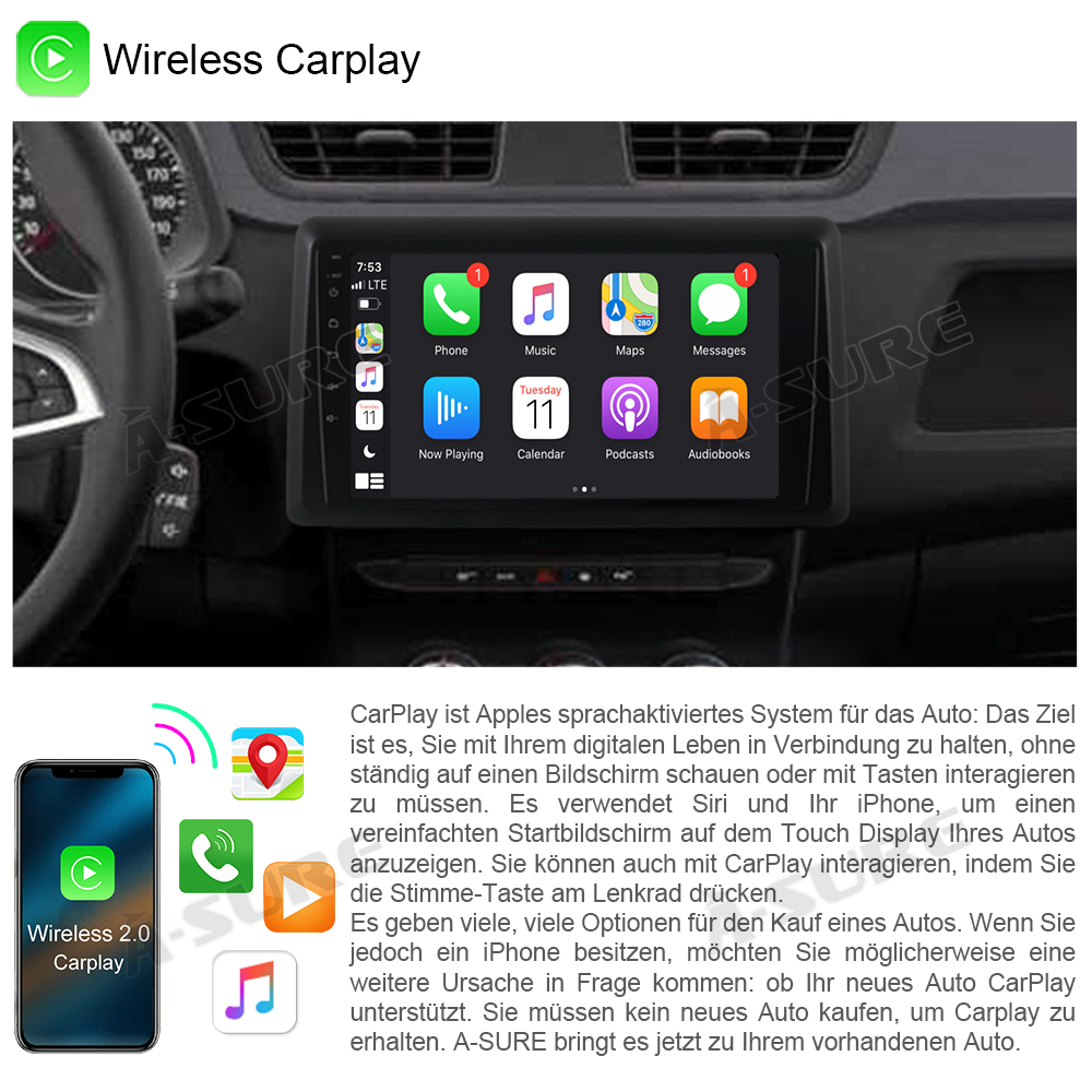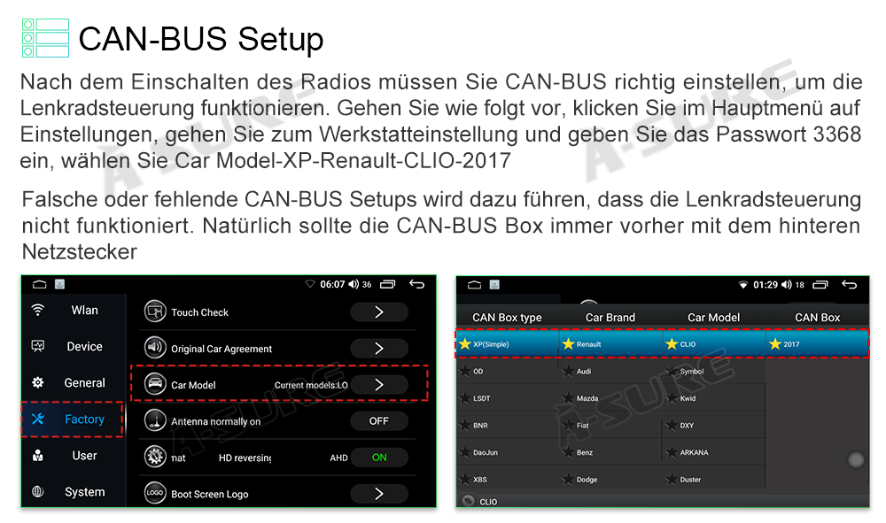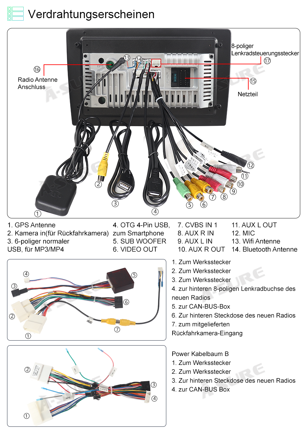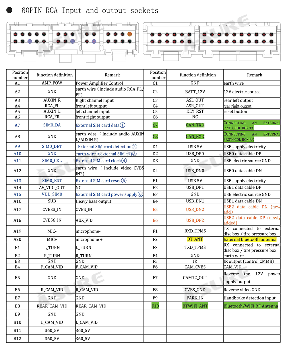Technische Parameter Passwort -Werkstatt Setup: 3368 Passwort -Werkseinstellung zurücksetzen: 0000 Main -IC-Arbeitstemperaturbereich: -30°C bis 70°C (Fahrzeug Standard) -OS: Android 14 -HD Decoder: 4K@60fps H.265 -Speicher: RAM Samsung DDR3 2GB; ROM 32GB 8MP IPS -CPU: 4 Core CPU ARM Cortex A7 4,1.2GHZ*4 GPU: ARM Mali T820 MP -Chipsatz: si4745 -Multipoint Kapazitiver -Intelligentes Update für Apps -Smartphone-Link: Integrierte Module von Carplay und Android Auto, Unterstützt wireless Verbindung -DIY-Thema - Unterstützt die originale Lenkradsteuerung, um mit dem Autoradio zu funktionieren. - Unterstützt 4G Dongle und WIFI Bildschirm -Auflösung 1280 720 Bildschirm - Touch Screen Funktion -Image Brightness /Contrast Color Adjustable IIlumination -7 traditionelleFarben, darunter Rot, Grün, Orange, Weiẞ, Blau, Cyan-Blau und Lila, Unterstützt benutzerdefinierter Farbe Bluetooth -Eingebaute Bluetooth -Freisprechfunktion Unterstützt Bluetooth MP3 Player Funktion A2DP (Hinweis: Diese Funktion kann nur realisiert werden, wenn das Telefon Bluetooth Audio Bluetooth Output unterstützt) Unterstützt BIuetooth Telefonbuch-Funktion Unterstutzt Bluetooth Verbindung für iPhone 4G & Wifi -Unterstützt 4G-LTE Wifi Dongle -ingebaute Wifi Modul GPS -GPS Port: COM2 -GPS Baud Rate: 9600 -GPS-Dual-Zonen-Funktion: Nutzen Sie die Navigation, während Sie Musik gleichzeitig hören -GPS-Sprache: Japanisch/ Russisch / Chinesisch/ Deutsch / Italienisch / FranZÖsisch/ Arabisch / Griechisch/ Portugiesisch/ Niederländisch etc. -GPS-Audio: Arbeit mit Front- und Hinter Lautsprechern USB -OTG USB-Anschluss: Unterstützt die Verbindung mit dem iPhone für Wireless Carplay, Verbindung mit Android Handy für verdrahte Android Auto - USB2.0 Port: Unterstützt USB-Flash-Laufwerk mit maximaler 64G-Kompatibilität, Kann keine tragbare Festplatte unterstützen. - Verfügbare Videoformate: MPEG-1/2/4, H264, H263, VC1, RV, RMVB, DivX,Sorenson Spark. Spark. VP8. AVS Stream Radio -Eingebauter Radio-Tuner (18 Preset-Stationen) -FM(3*6):76.0MHZ-108.OMHZ -Eingebaute RDS Funkempfängerfunktion (Europa) Eingang&Ausgang -1*Radioantenneneingang -1*GPSAntenneneingang -RCA Videoausgang 2/Rückfahrkamera Videoeingang*1/ Video IN 1 -RCA Audio FRFLRR/RL/ Subwoofer 1/ Subwoofer2 Ausgang AUX Audio R/L Eingang