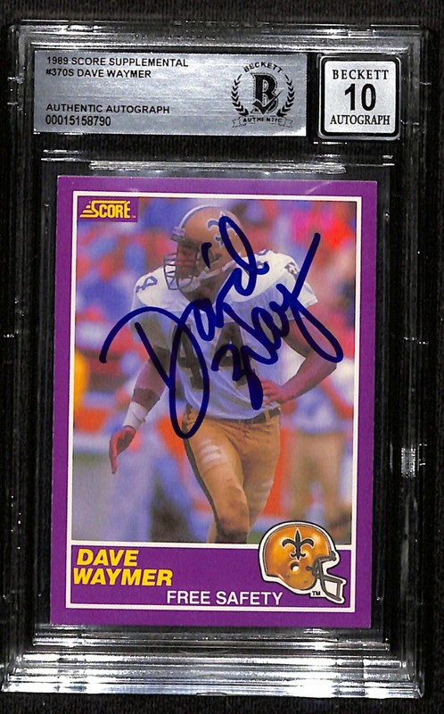 Autographed 1989 Score Supplemental #3705 signed in blue permanent marker by New Orleans Saints Safety Dave Waymer (died 1993). From the Steve Grad Autograph Collectio and obtained in person by Steve. The autograph has been authenticated and graded a perfect 10 by Beckett Authentication Services.