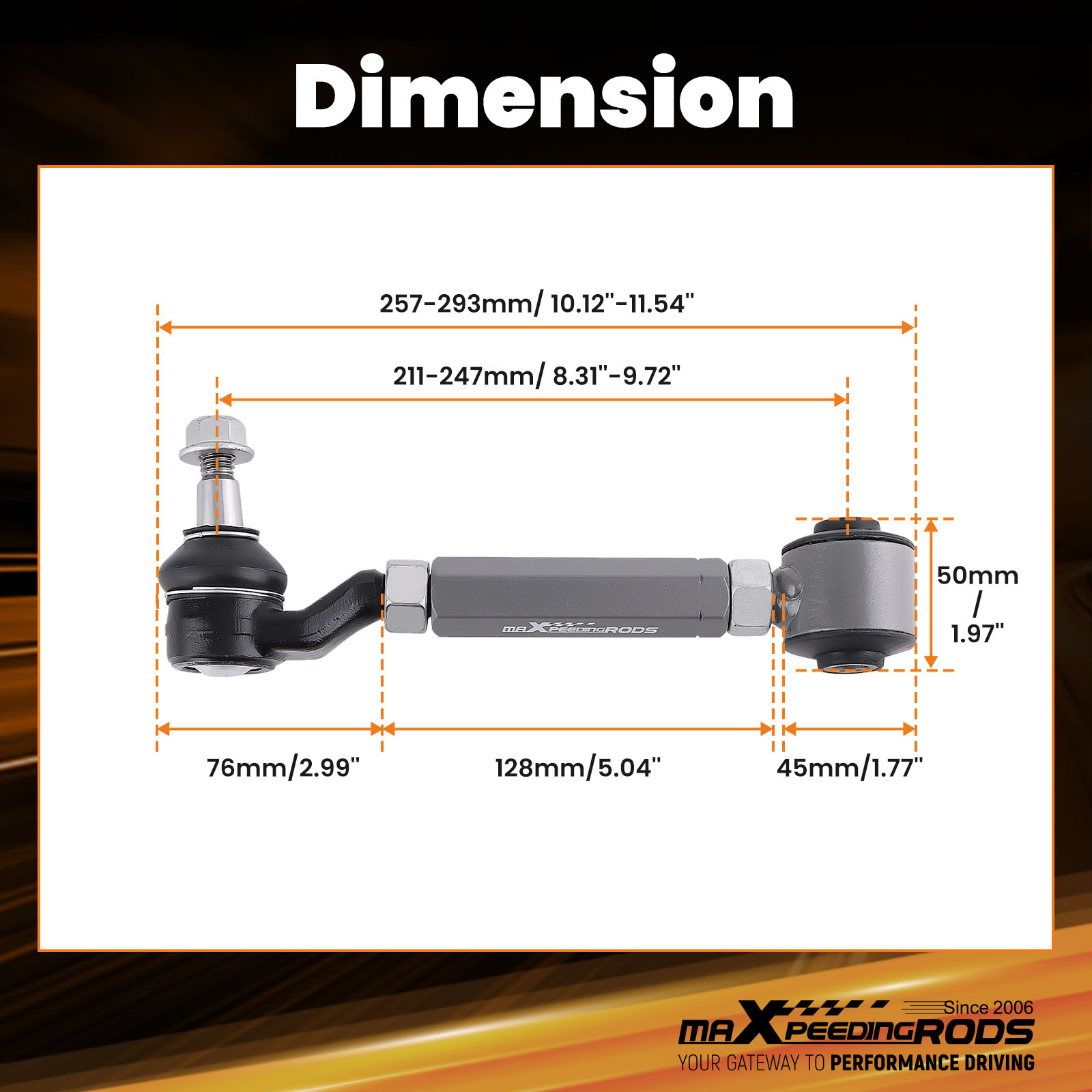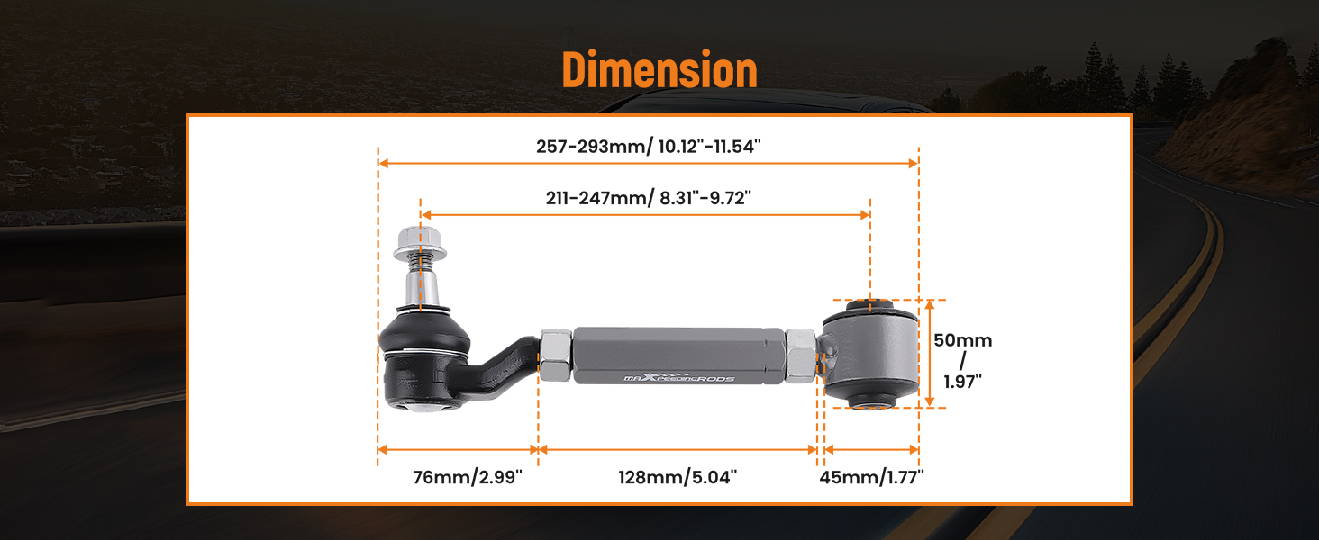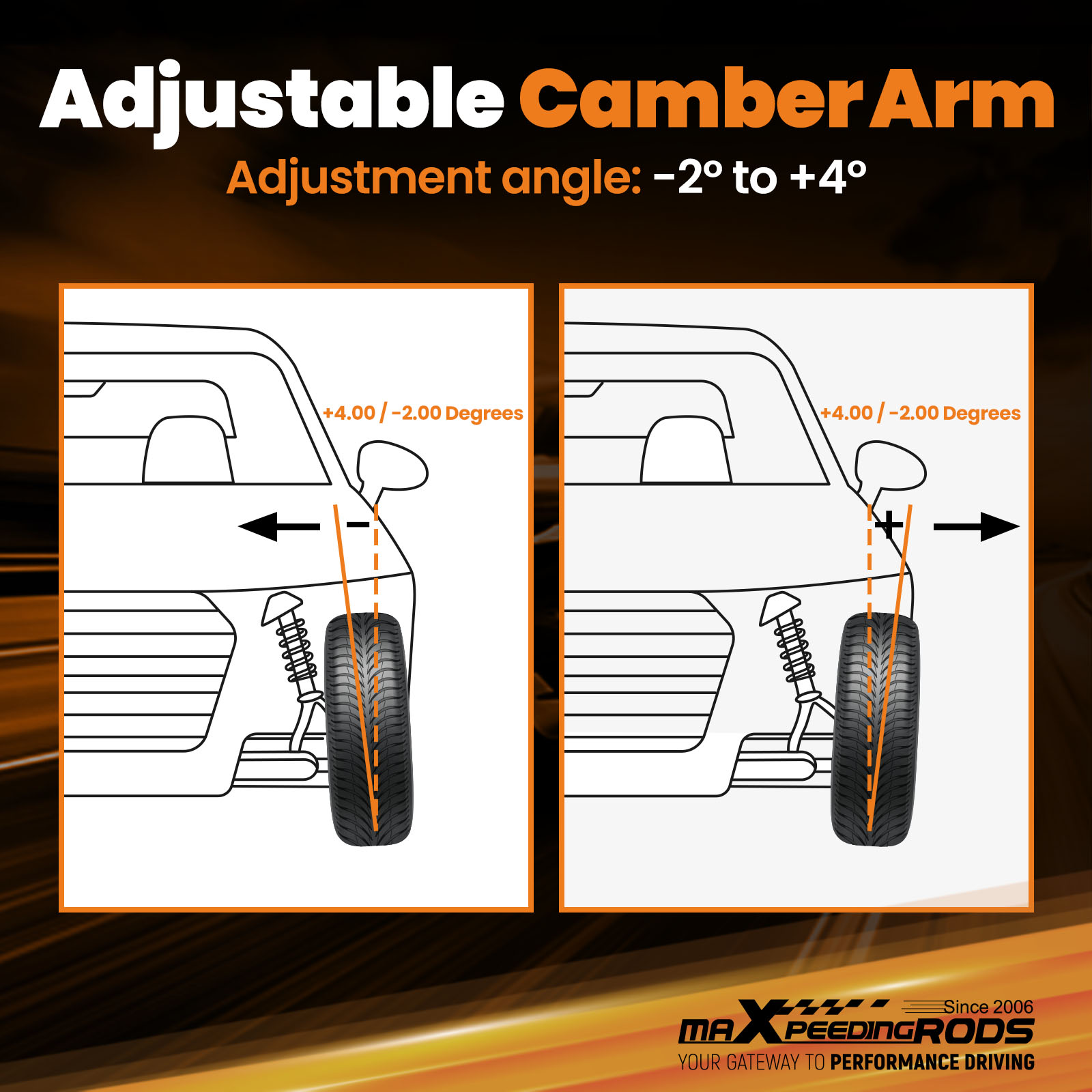 * Adjustment angle: Rear Adjustable Control Arms - Camber: -2.00 degrees to +4.00 degrees.