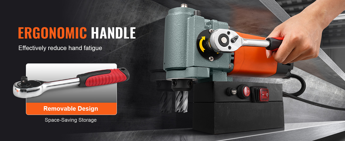 The handle is easily detachable, allowing you to carry it to different work sites or store it in limited spaces. Designed with a lever principle, the magnetic drill provides a more comfortable and labor-saving use, reducing fatigue during operation.