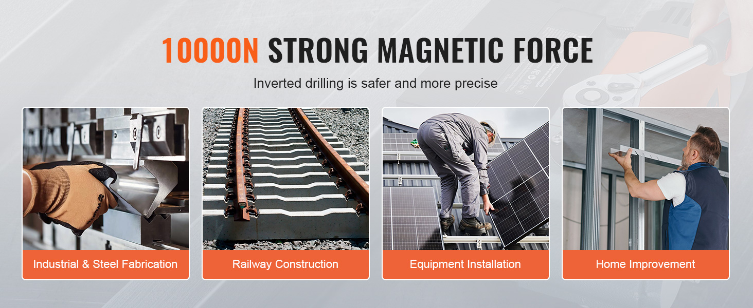 Designed for safety and durability, our mag drill features overload protection to prevent damage from excessive load. The cooling device keeps the press at low temperatures during high-load operation, extending its lifespan. With a strong magnetic force of 10000N, safety is enhanced during use.