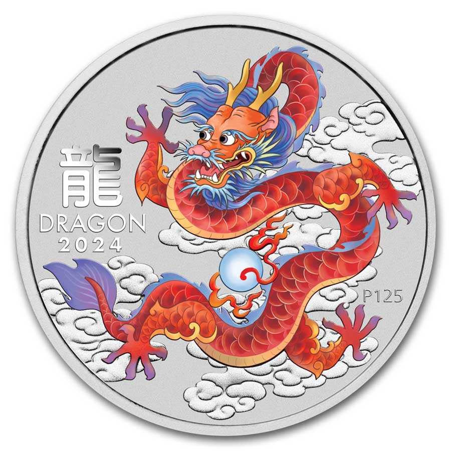 APMEX is an authorized distributor of Perth Mint products, allowing APMEX to get coins directly from The Perth Mint and pass them along to you. This Year of the Dragon coin would make a great addition to any lunar collection. Add this spectacular 2024-P125 1/2 oz Silver Year of the Dragon colorized coin to your cart today!