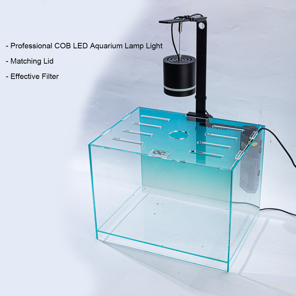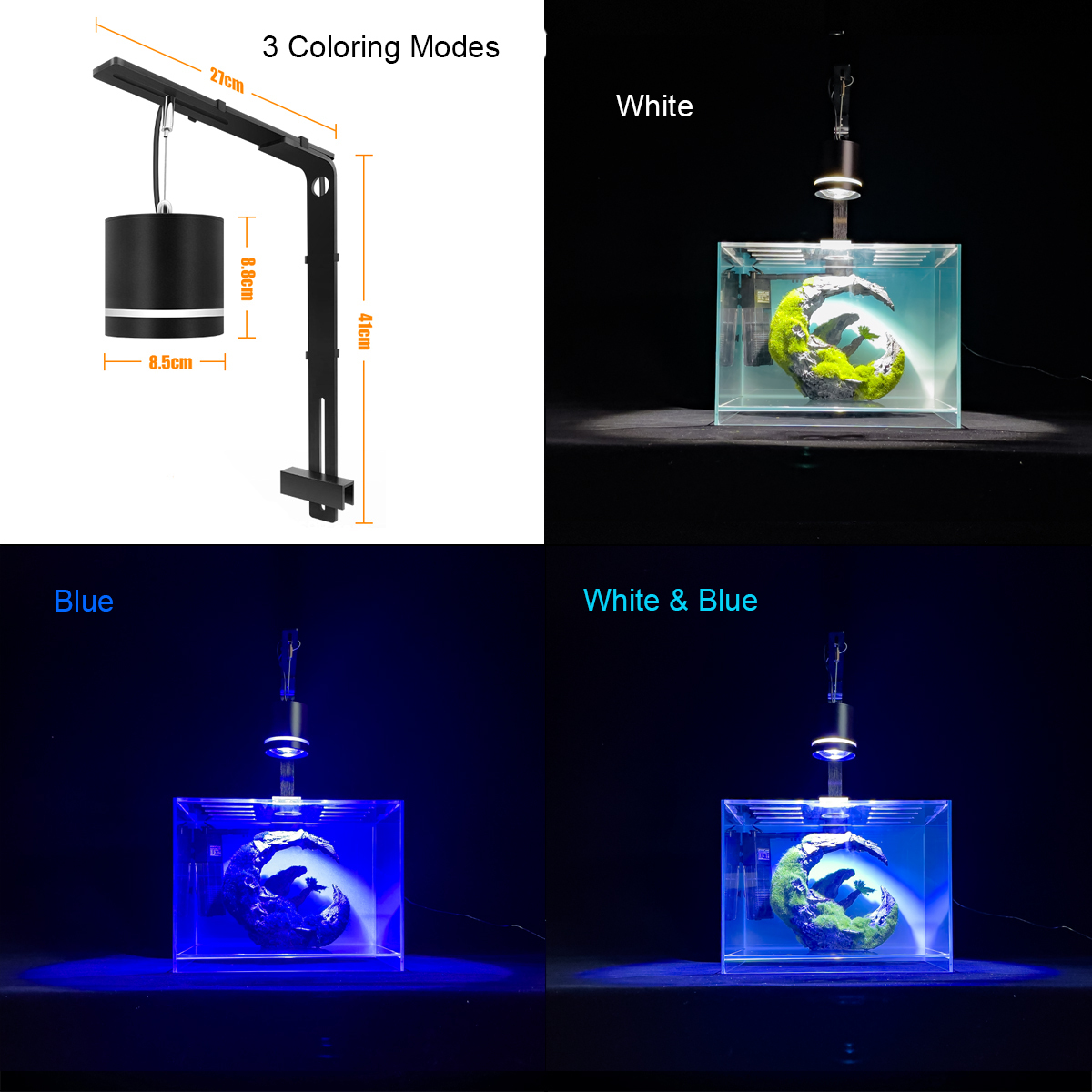 - COB LED Aquarium Lamp: Enhance your tank with our premium COB LED lamp featuring a durable aluminum body and three distinct coloring modes—Daylight, Blue Moonlight, and Color Enhance—to create the perfect lighting environment.