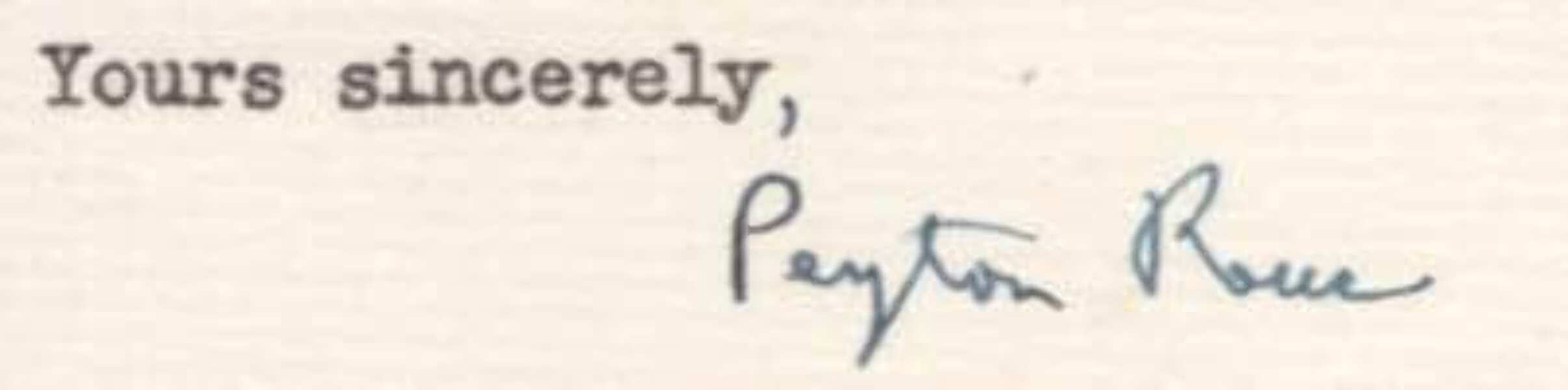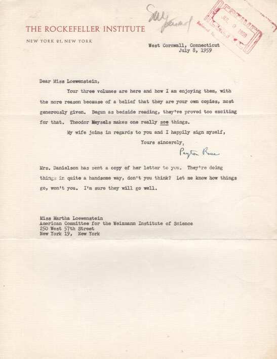 Typed letter signed, one page, 8,5 x 11 inch, `The Rockefeller Institute` stationery, West Cornwall (Connecticut), 8.07.1959, to a "Miss Loewenstein" - concerning "Your three volumes", signed in blue ink "Peyton Rous", with a horizontal letter fold and very mild signs of wear to the upper edge - in fine to very fine condition.