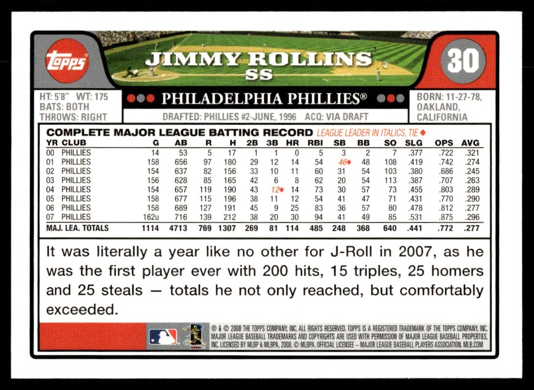 | 2008 Topps Baseball Card Jimmy Rollins Philadelphia Phillies #30 |