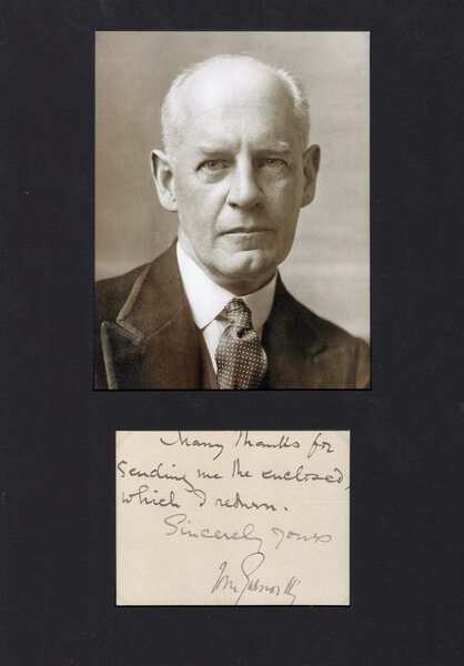 Autograph note signed, one page (cardboard), 4,25 x 3,25 inch, written and signed in blue ink "John Galsworthy", attractively mounted (removable) for fine display with a photograph, shows John Galsworthy in a close-up portrait (altogether 8,25 x 11,75), with mild signs of age wear - in fine to very fine condition.