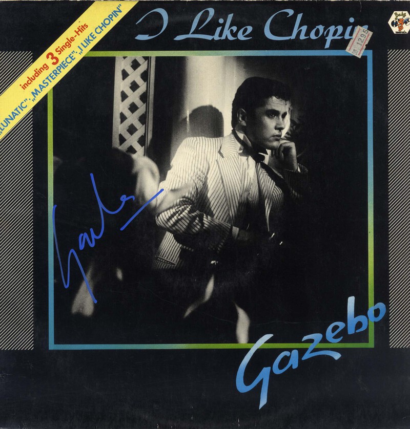Signed vinyl record cover `Gazebo - I Like Chopin`, 12,25 x 12,25 inch, signed on the front cover in blue felt tip "Gazebo", with signs of wear to the edges - in fine condition. Accompanied by the vinyl record.