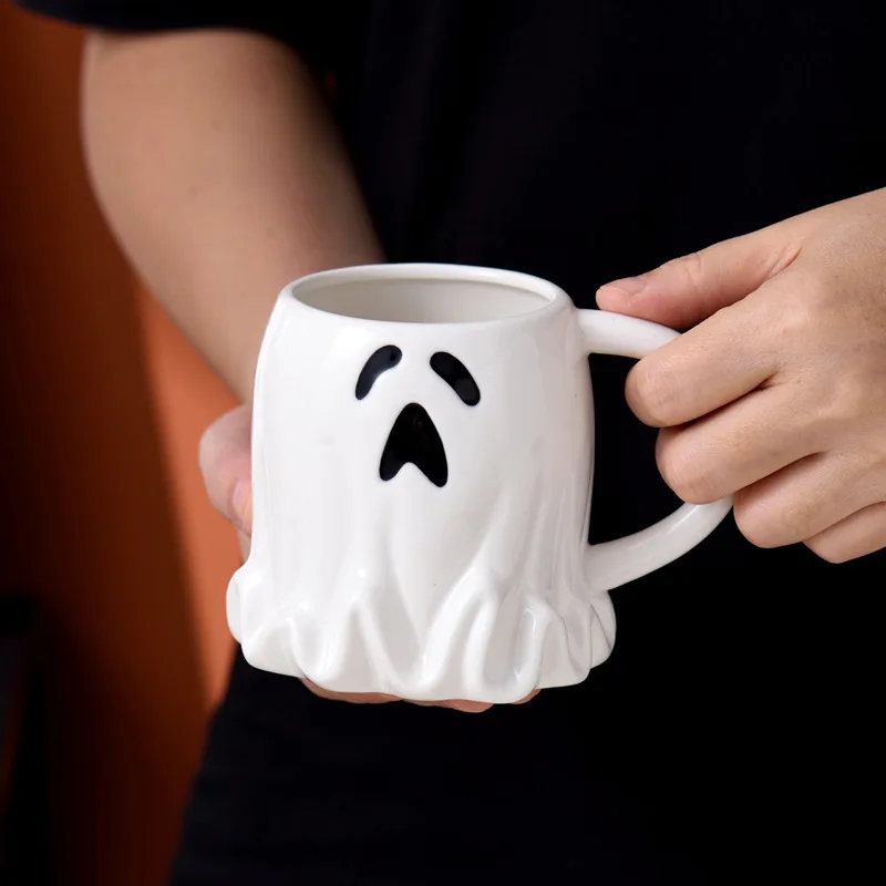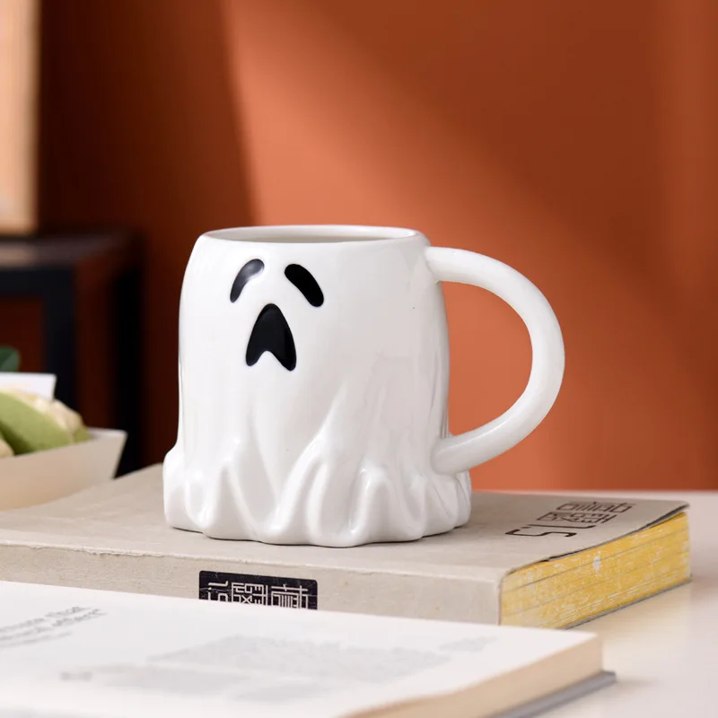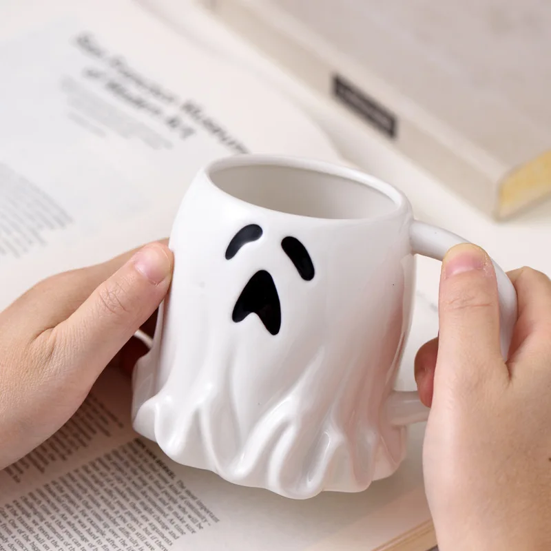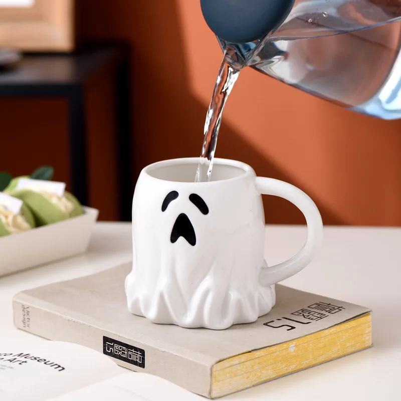 1pc 400ml Cute Ghost Shaped Mug with Spoon Elf Ceramic Coffee Cup Halloween Ghost Pattern Magic Cup for Friends Couple Cups Gift