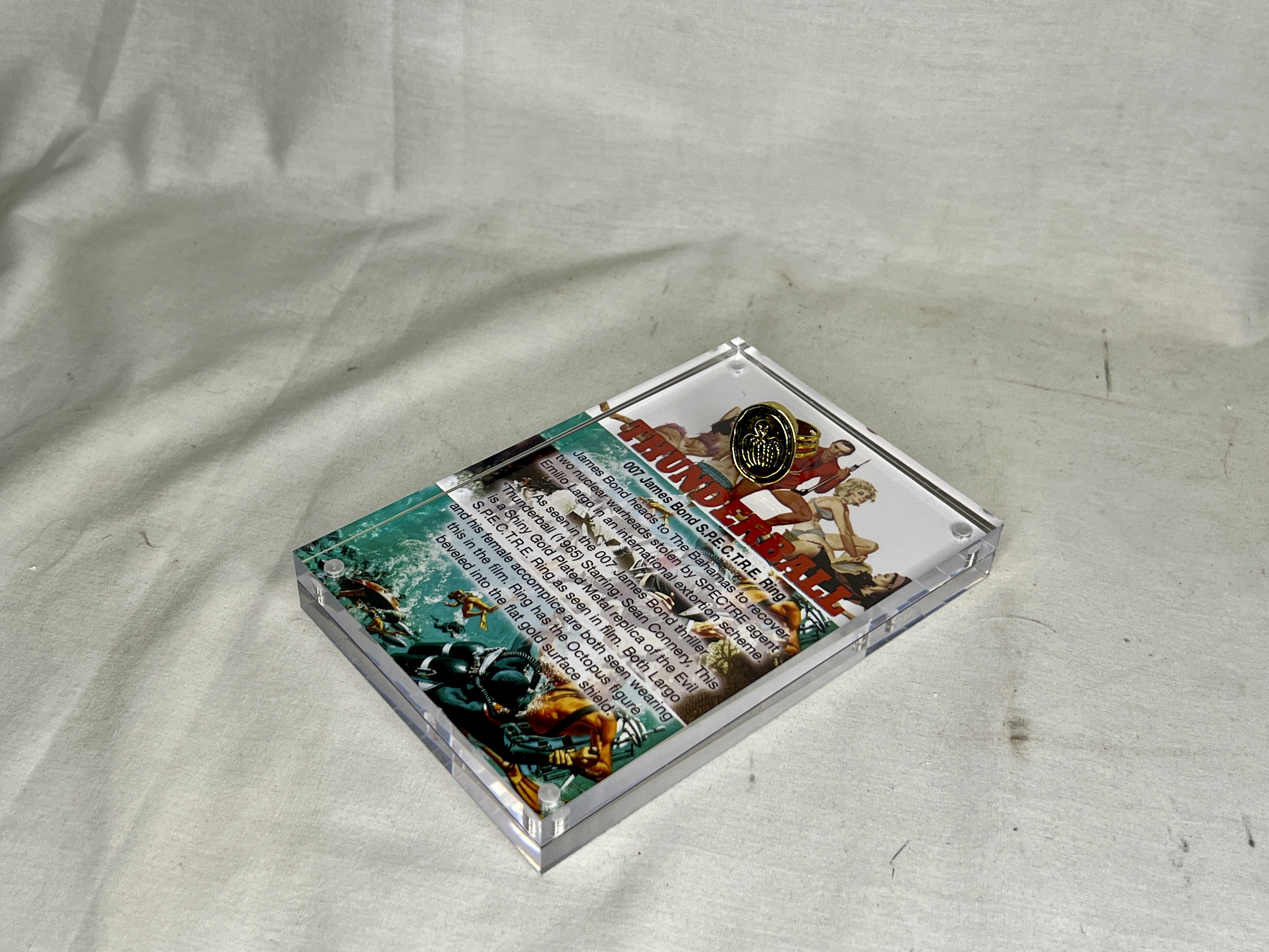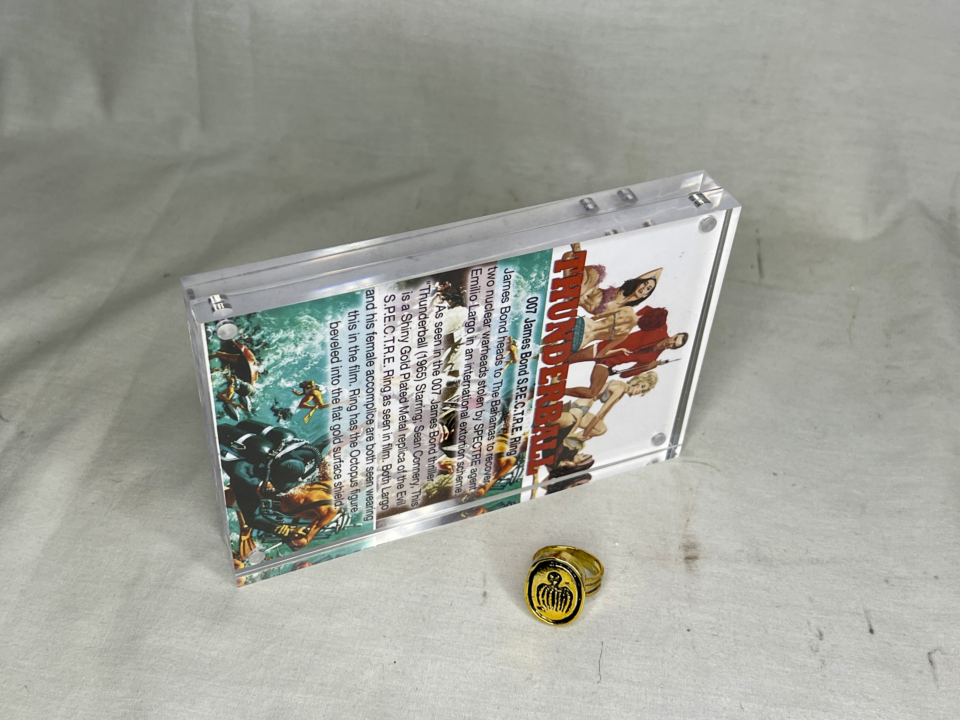 This is a Very Detailed, Signed, Numbered, Limited Edition Movie Prop Replica of the 007 James Bond SPECTRE Ring, Type B as seen in The 007 thriller Thunderball (1965) starring: Sean Connery as James Bond. Both Largo and his female accomplice are both seen wearing this in the film. The Real Prop Replica SPECTRE Ring is an Artists Rendering created from various photographs, books and how it appears in the Film. Each item Comes Complete with a Double Sided, 4 x 6 inch, Full Color, Professionally Printed, Certification Card. This Documentation contains Poster Art and Explains in Detail about the 007 SPECTRE Ring and how it was used in the film. Ring comes Brand New inside a Jewelry Box.