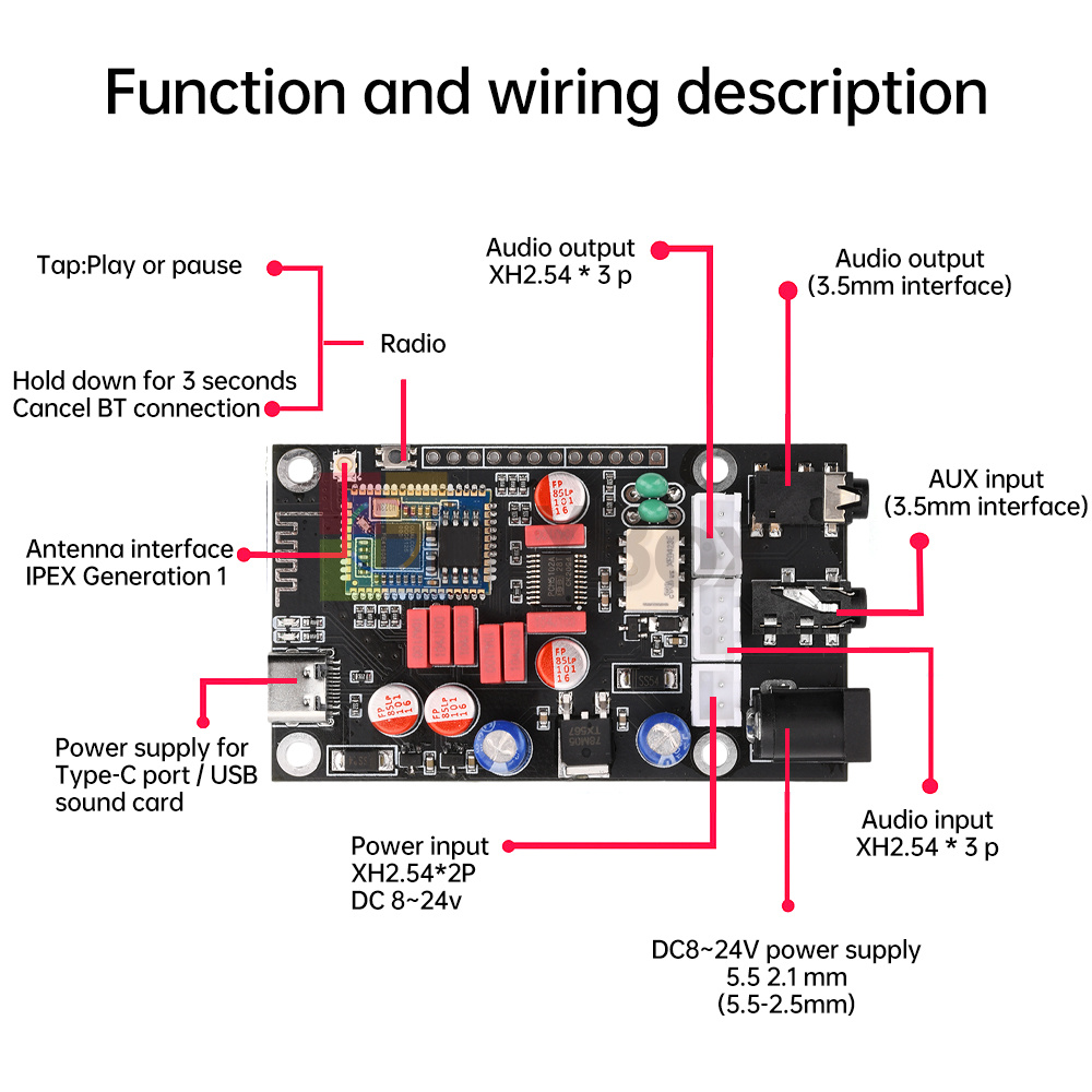 1. The device is reserved for DC interface, audio input AUX interface and headphone output port, and compatible with XH2.54 interface, providing a wealth of product interfaces, users can freely choose according to demand, more convenient to use.