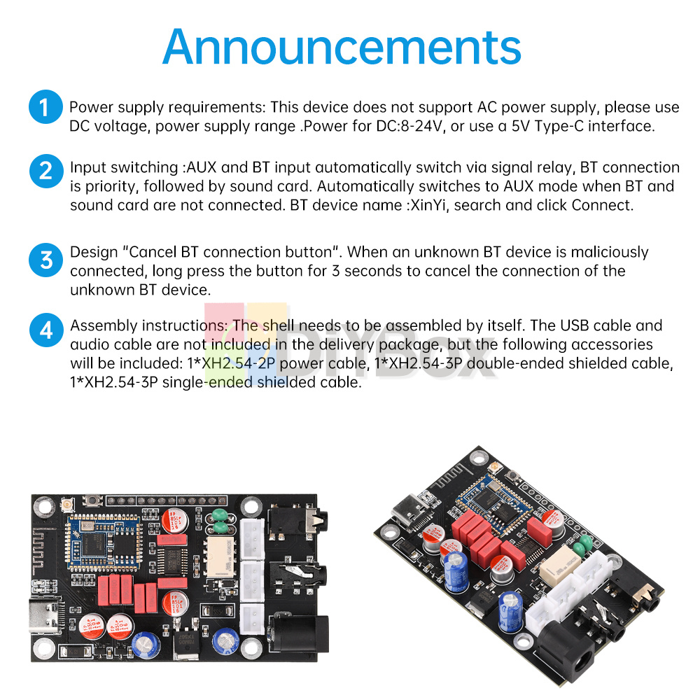 2 Input switching:AUX and Bluetooth inputs are automatically switched through the signal relay, Bluetooth connection is prioritized, followed by the sound card. When Bluetooth and sound card are not connected, it automatically switches to AUX mode.