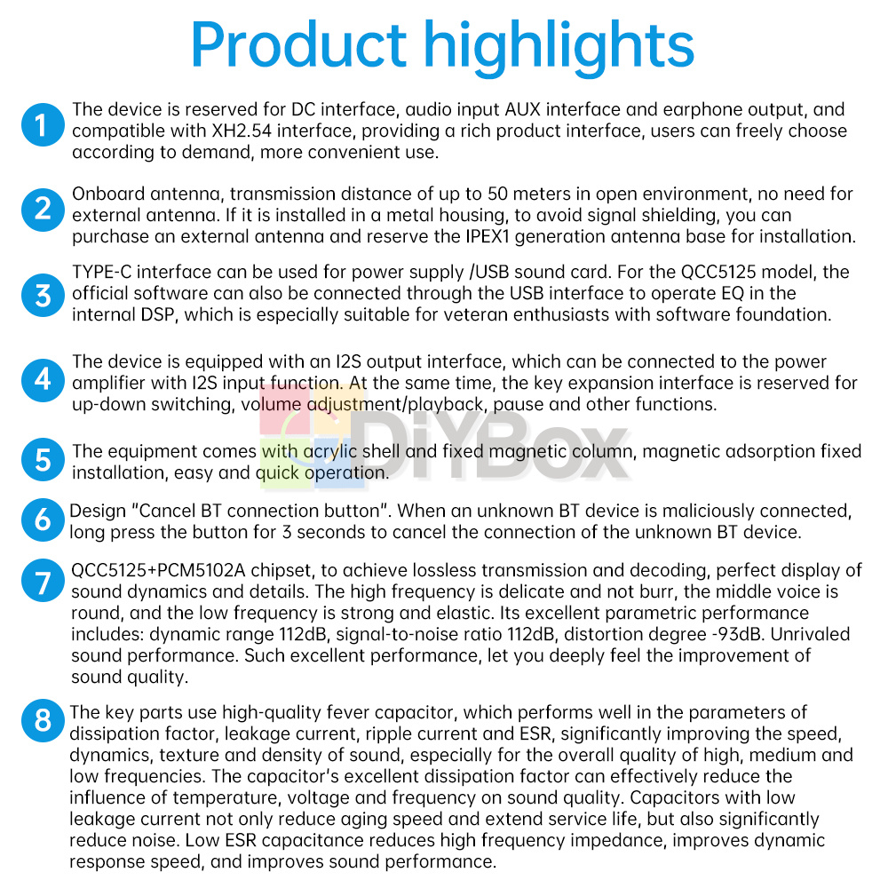 7. QCC5125+PCM5102A chipset, realize lossless transmission and decoding, perfectly show the sound of each dynamic and details. The high frequency is delicate and not burr, the midrange is rounded, and the low frequency is powerful and elastic. Its excellent parameters include: dynamic range of 112dB, signal-to-noise ratio of 112dB, distortion -93dB, highlighting the unparalleled sound quality performance. With such excellent performance, you can deeply feel the sound quality improvement.