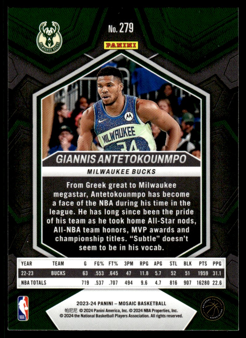 | 2023-24 Panini Mosaic Basketball Giannis Antetokounmpo Milwaukee Bucks #279 |