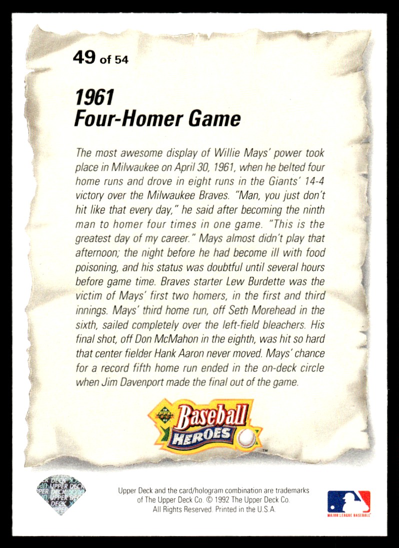 | 1993 Upper Deck Baseball Heroes Willie Mays New York Giants #49 |