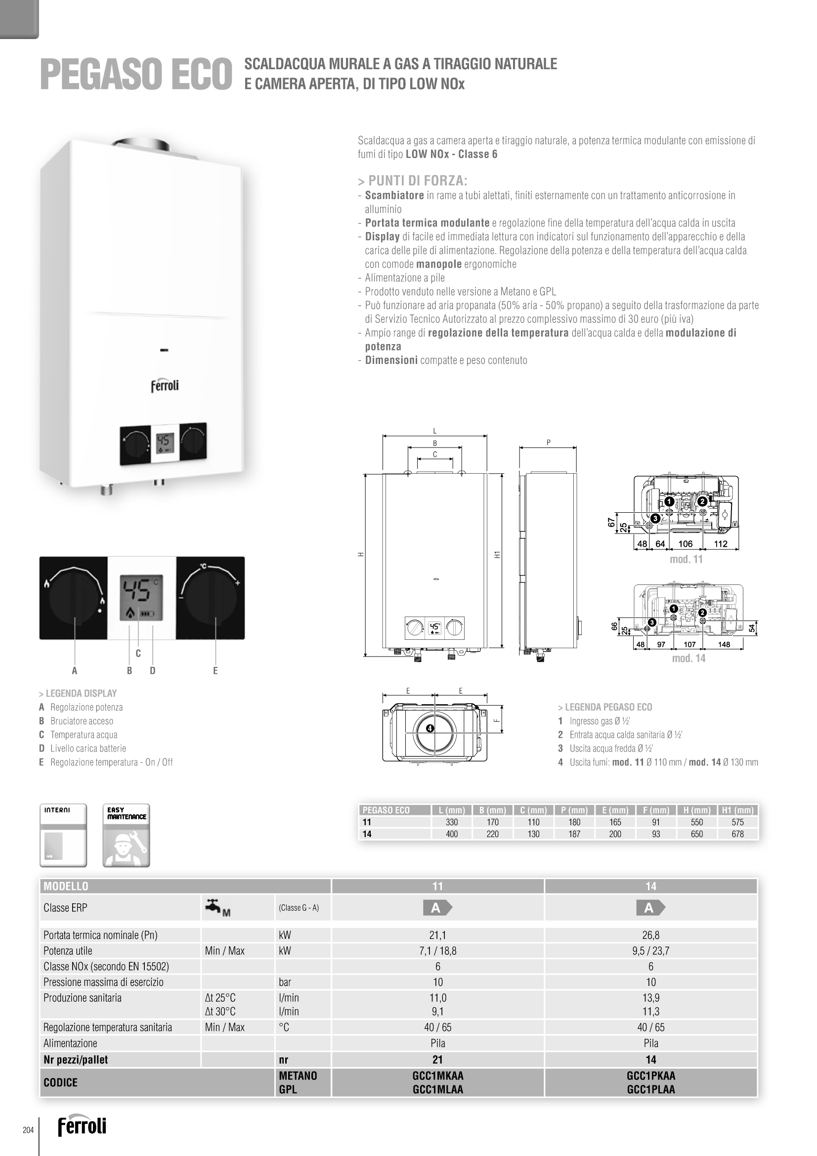 SCALDABAGNO FERROLI PEGASO ECO 11 LITRI GPL CAMERA APERTA