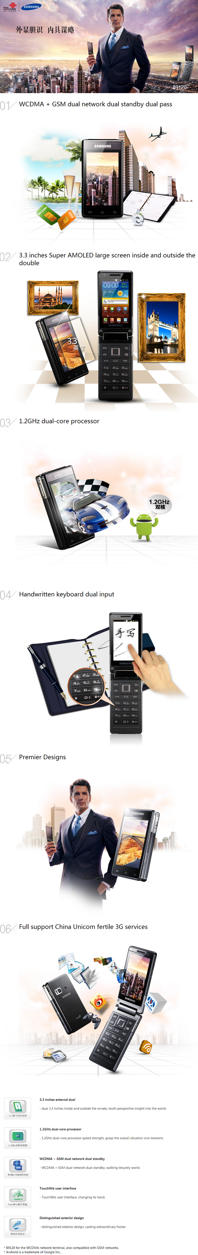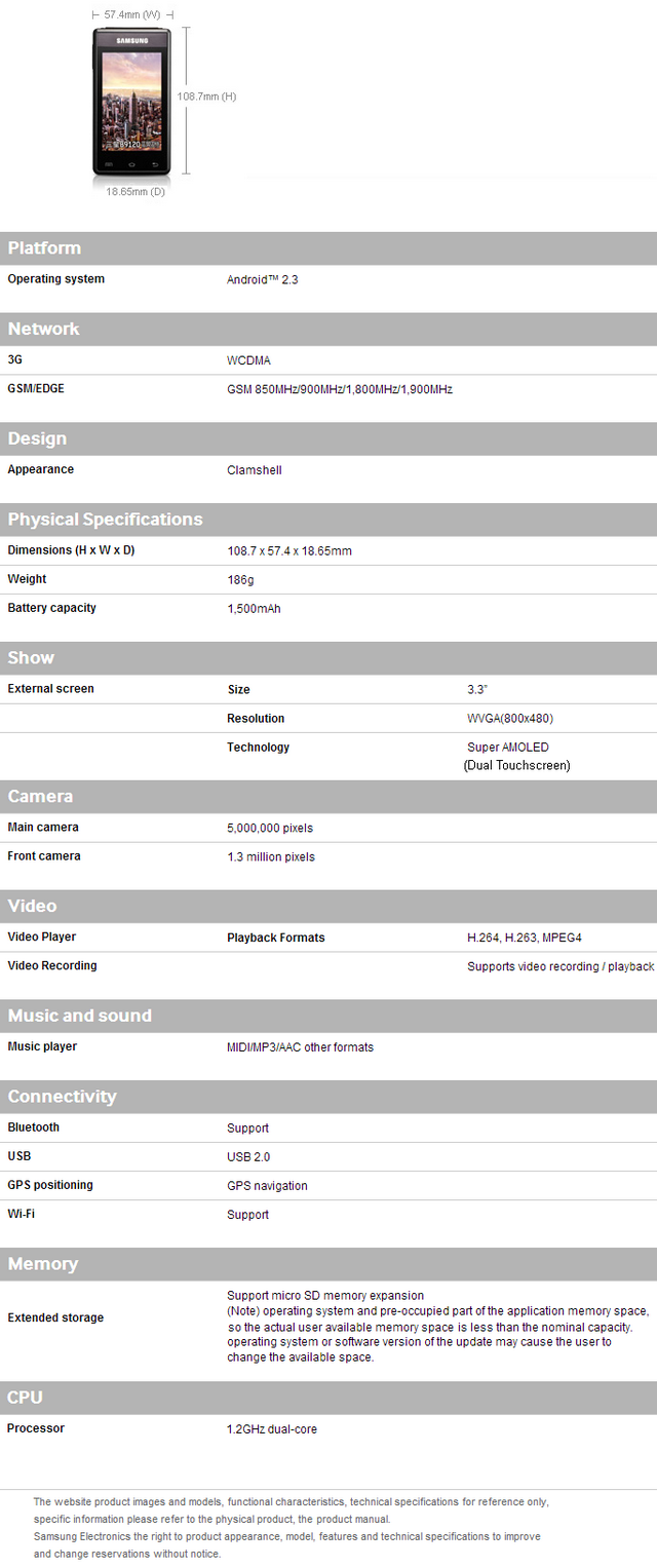 | Samsung GT-B9120 16GB 5MP 2-Core 3.3" Dual SIM Active 3G Android Flip Smartphone Brand: Samsung Model: GT-B9120 Condition: New in Box Color(s): Dark Grey CPU: Dual-Core 1.2GHz (Qualcomm Snapdragon MSM8260) RAM: 1GB RAM ROM: 16GB ROM OS: Android 2.3.6 Language(s): English, Korean, Simplified Chinese SIM: SIM 1 - Mini-SIM / SIM 2 - Mini-SIM (not Micro-SIM or Nano-SIM) Simlock: Factory Unlocked to accept any SIM Network: SIM 1 - GSM (2G) 850/900/1800/1900 & UMTS (3G) 900/2100 Network: SIM 2 - GSM (2G) 850/900/1800/1900 Compatibility: Please make sure to check if your Cellular Carrier provides the above supported Network Frequency Bands of this phone before purchase as we do not accept any return for network incompatibility issues. Note(s): This phone will be flashed with Root Access & Google Apps. Contact us if you do not need this service. Contents: Android Smartphone, Removable Battery (1500mAh), Power Adapter, Micro-USB Cable, Stereo Earphones, Chinese Manual |