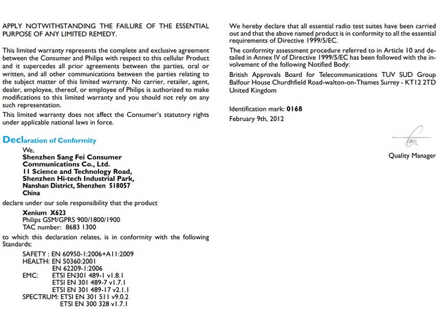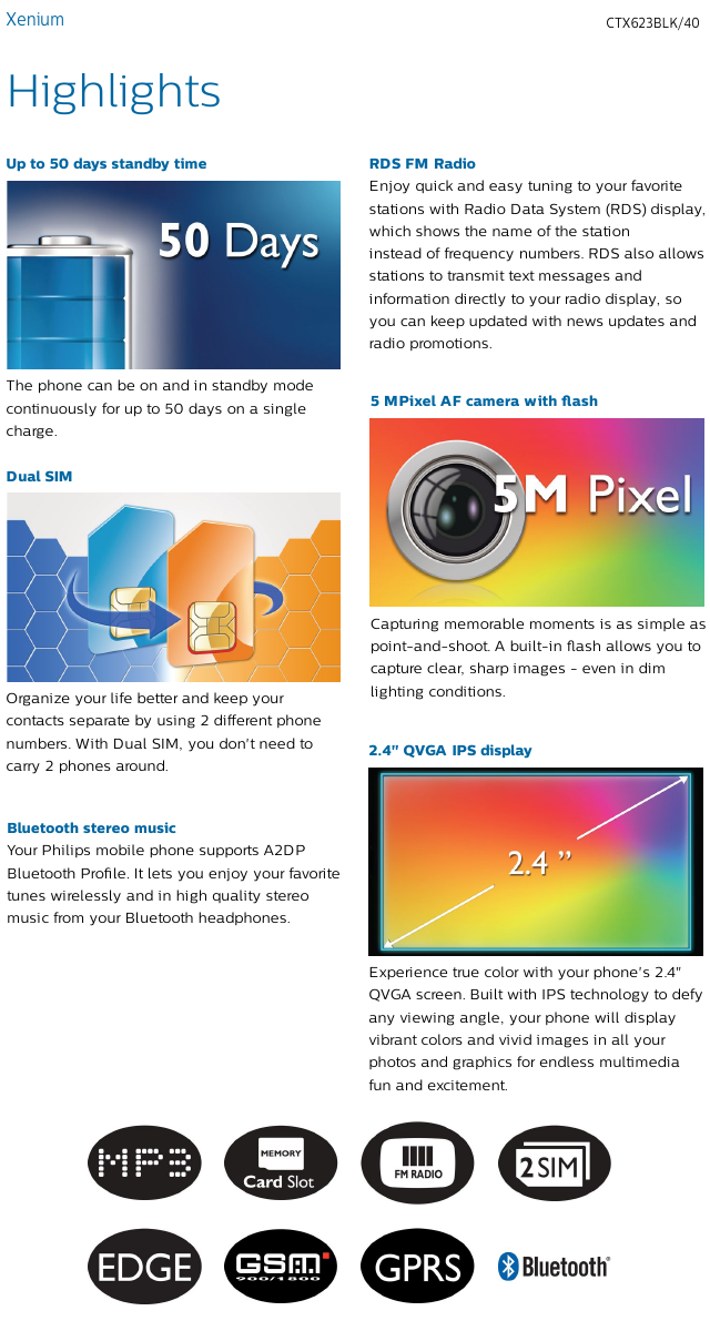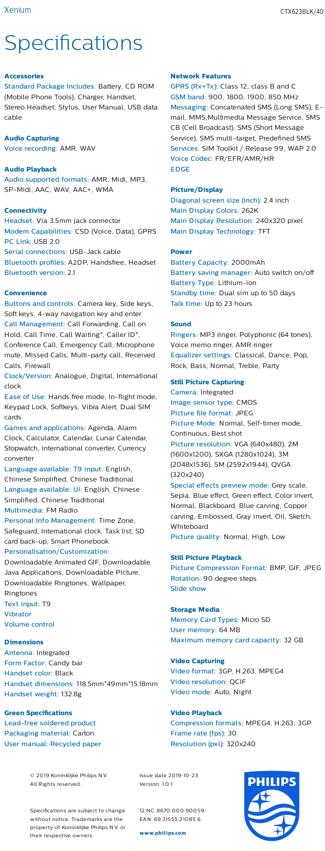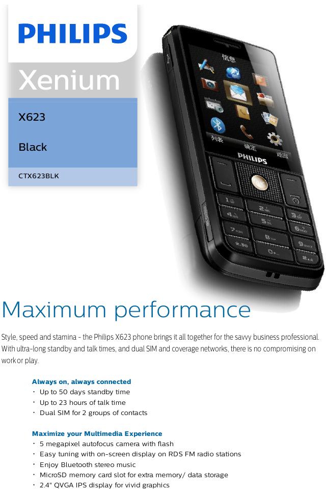 | Philips Xenium X623 5MP AF IPS LCD Dual SIM Standby GSM EDGE Quadband Cell Phone Brand: Philips Model: Xenium X623 Condition: New in Box Color(s): Black ---------------------------------------------------------------------------------------------------------------------- Please note that this phone is now available in the following Firmware(s) from Philips. Therefore, please let us know your preferred Firmware(s) after purchase. Available Firmware(s) from Philips : 1) Chinese Firmware: comes with the following languages - English, Simplified Chinese, Traditional Chinese 2) Russian Firmware: comes with the following languages - English, Russian (Русский), Ukrainian (Українська), Romanian (Română) ---------------------------------------------------------------------------------------------------------------------- SIM: SIM 1 - Mini-SIM / SIM 2 - Mini-SIM (not Micro-SIM or Nano-SIM) Simlock: Factory Unlocked to accept any SIM Network: SIM 1 - GSM (2G) 850/900/1800/1900 Network: SIM 2 - GSM (2G) 850/900/1800/1900 Compatibility: Please make sure to check if your Cellular Carrier provides the above supported Network Frequency Bands of this phone before purchase as we do not accept any return for network incompatibility issues. Note(s): The English User Manual (PDF) of this phone by Philips is available upon request. Contents: Cell Phone, Removable Battery (2000mAh), Power Adapter, Micro-USB Cable, Stereo Earphones, Chinese Manual |